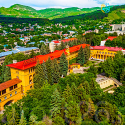 - Кисловодск 890 м до Долины РозЛидер по количеству положительных отзывов о врачах и медицинском персонале. В 2018 году награжден Золотой медалью в номинации «Лучшая бальнеолечебница» • Расположен в Верхней части Курортного парка рядом с Канаткой, Храмом воздуха и Долиной роз. Зона с уникальным микроклиматом на высоте 950 м: мягкий перепад высот и обогащенный фитоциндами горный воздух благотворно влияют на дыхательную и сердечно-сосудистую систему • Собственный бювет с минеральной водой двух курортов «Ессентуки № 4» и «Славяновская» (Железноводск). 10 минут прогулки до Ребровского бювета с Доломитным и Общим нарзаном Кисловодска • Санаторий — памятник истории и архитектуры федерального значения. Комплекс проектировали знаменитые архитекторы 20 века: Гинзбург, Вахтангов, Шпалек, Полюдов и др. Внутренняя отделка выполнена из ценных пород дерева (орех, дуб, чинара, карагач) и мрамора «Артик». В разное время в санатории проходили лечение Чуковский, Королёв, Утесов, Райкин, Эдита Пьеха, Алексей Толстой, Толкунова, Русланова, Этуш, Жванецкий и др. • Включено трёхразовое питание «меню-заказ». Блюда подают в красивом зале с высокими потолками, колоннами и лепниной • Крытый бассейн 15×6 метров с видом на лес. В бассейне проводятся занятия аквааэробикой • Термальная зона с сауной, бассейном-купелью, зоной контрастного душа, комнатой отдыха, где можно попробовать вкусный фиточай • Лесопарковая территория 24 га с зонами отдыха, фонтанами, тенистыми аллеями. Вокруг прекрасные виды, никакого транспорта и шума • Аэросолярий на крыше с красивыми видами на горы Кавказа и парк санатория и лес • Спокойная программа развлечений: вечера караоке, бардовской песни и танцев, концерты, турниры по настольным играм • Здоровое движение: ЛФК, плавание, теннисные корты, спортзал, спортивная площадка, прогулки по терренкурам с инструктором. Занятия ЛФК проводятся в зале с витражными окнами и видом на горы • Размещение и лечение детей с 4-х лет. Есть детская комната с воспитателем. В летнее время на открытой танцевальной площадке проводятся тематические детские праздники с ростовыми куклами. Работает прокат детских велосипедов, машинок и самокатов • Приём врачей 18 профилей, включая редкие — врач-эндоскопист, врач-проктолог, врач-дерматолог. В штате 167 специалистов, среди них 15 врачей и 57 медсестёр с высшей квалификационной категории • Своя лаборатория (185 ключевых исследований и 5 аллергологических панелей). Диагностика: мониторинг ЭКГ и АД по Холтеру, УЗИ сердца и сосудов, реоэнцефалография, спирометрия, видеоректороманоскопия, видеоколоноскопия и ЭГДС на современном оборудовании премиум-класса • 18 видов физиотерапии. Лечебные ванны и души, включая нарзанные ванны с природной минеральной водой. Ингаляции и соляная комната. Классический и аппаратный массаж. Рефлексотерапия. Грязелечение и парафинотерапия. Баротерапия. Озонотерапия. Общая криотерапия. Лечебные капельницы • Улучшение мозгового кровообращения и кислородообмена: малая аутогемотерапия (МАГТ), инфитатерапия, барокамера, электросон, гипокситерапия • Здоровые суставы и спина: ударно-волновая терапия, прикладная кинезиотерапия, плазмолифтинг, магнитотерапия, «Магнитотурботрон» • Психотерапевтические методы коррекции — музыкотерапия, групповая и индивидуальная психотерапия • Косме