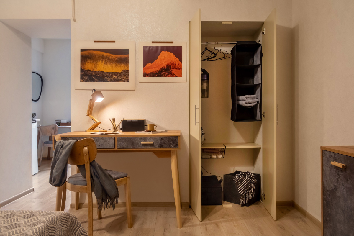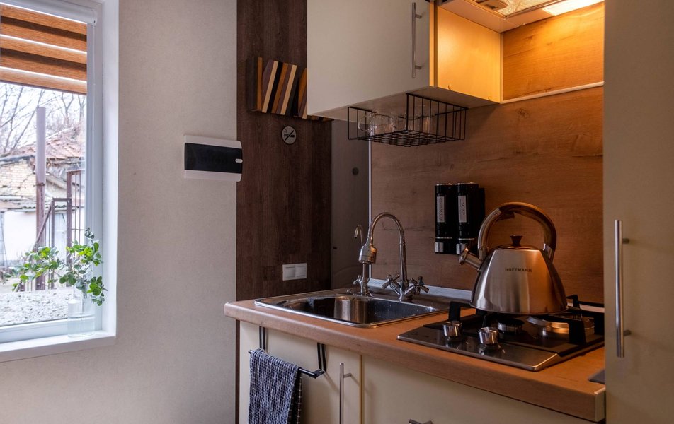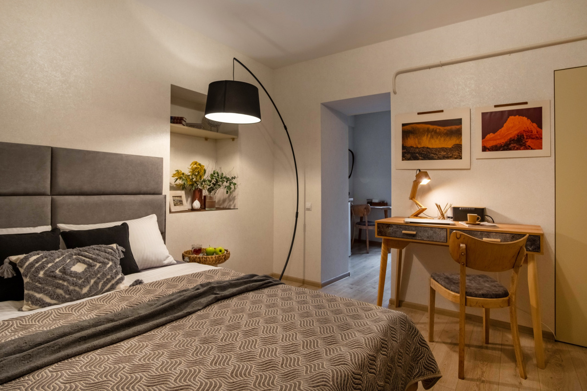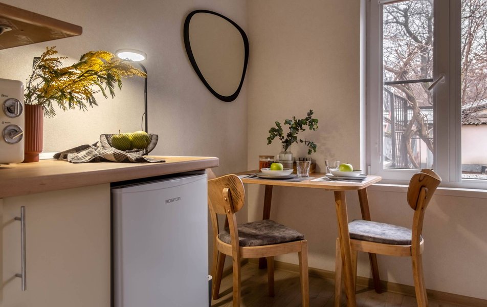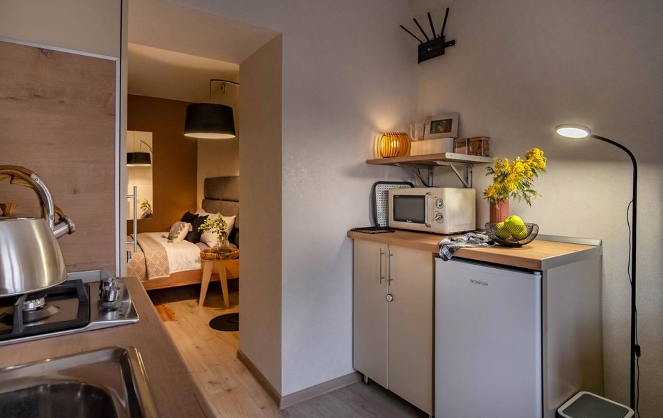 Уютные двухкомнатные апартаменты размещены в многоэтажном жилом доме. На первом этаже работают продуктовый магазин, кафе, салон красоты, в соседних зданиях — кофейня и пекарня.