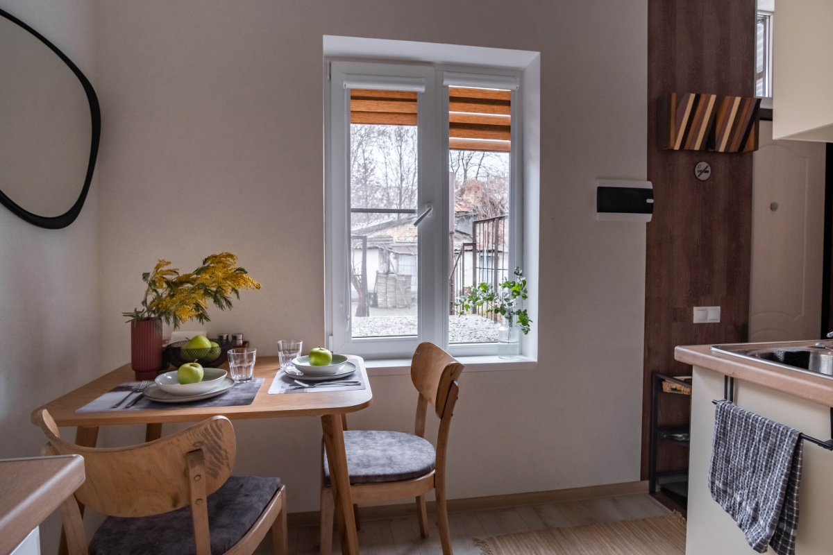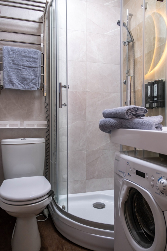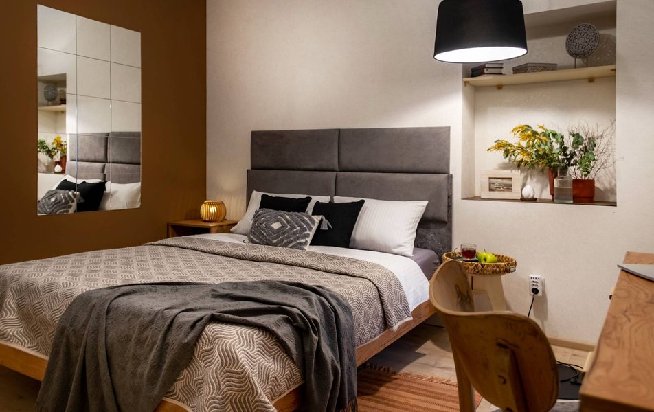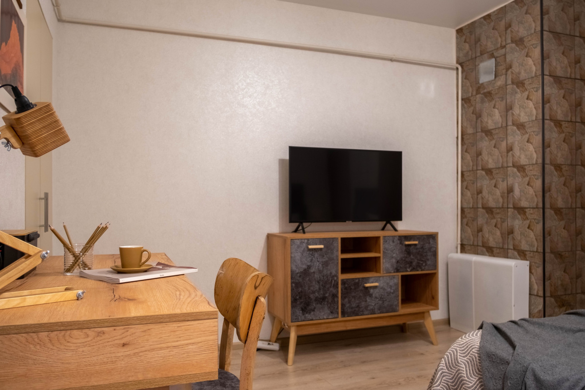 Уютные двухкомнатные апартаменты размещены в многоэтажном жилом доме. На первом этаже работают продуктовый магазин, кафе, салон красоты, в соседних зданиях — кофейня и пекарня.