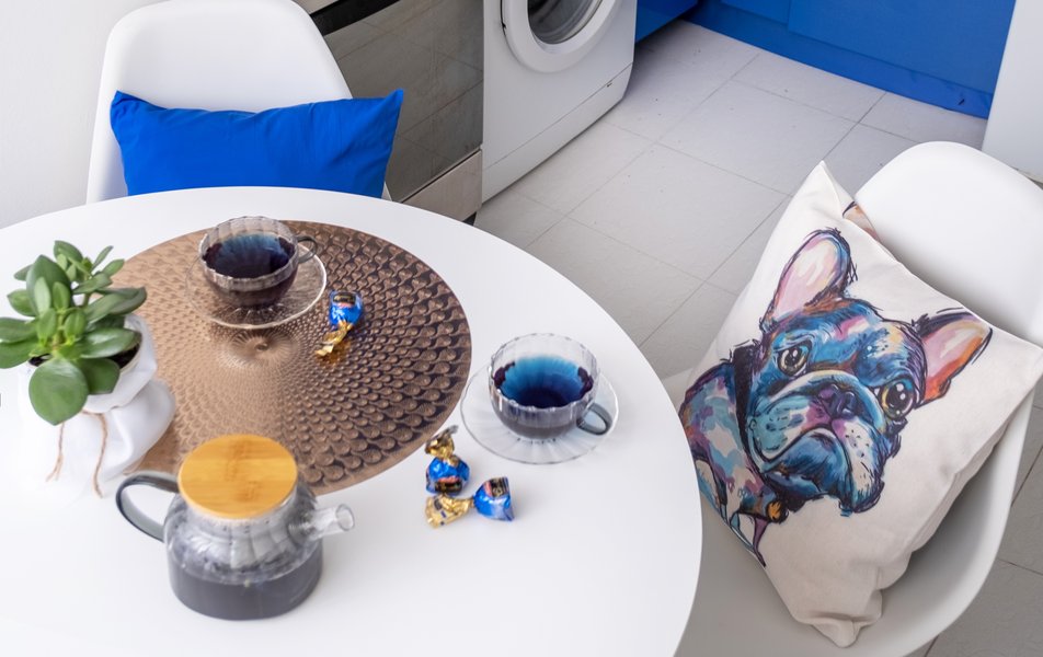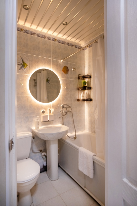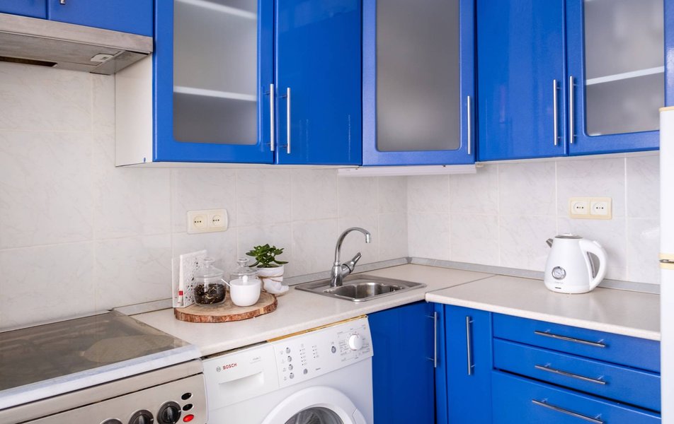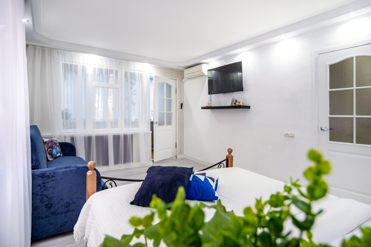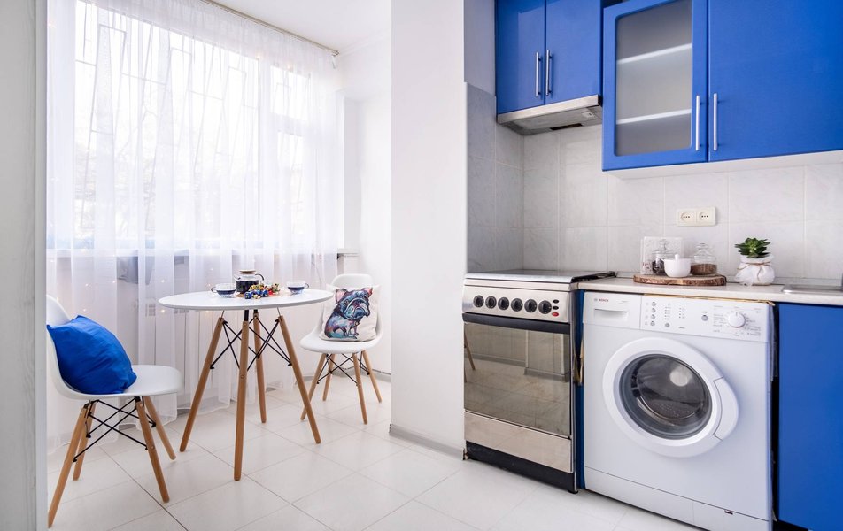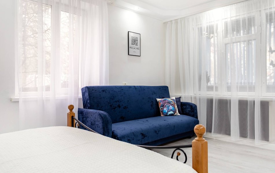 Апартаменты со стильным дизайнерским интерьером оформлены в светлых тонах и дополнены яркими акцентными деталями. Спальня укомплектована двуспальной кроватью и раскладным диваном. Есть выход на застекленный балкон с уютной зоной отдыха. В кухне оборудованы функциональное пространство для приготовления еды и компактная обеденная группа, установлена стиральная машина. Совмещенный санузел оснащен ванной. Можно подключиться к Wi-Fi.