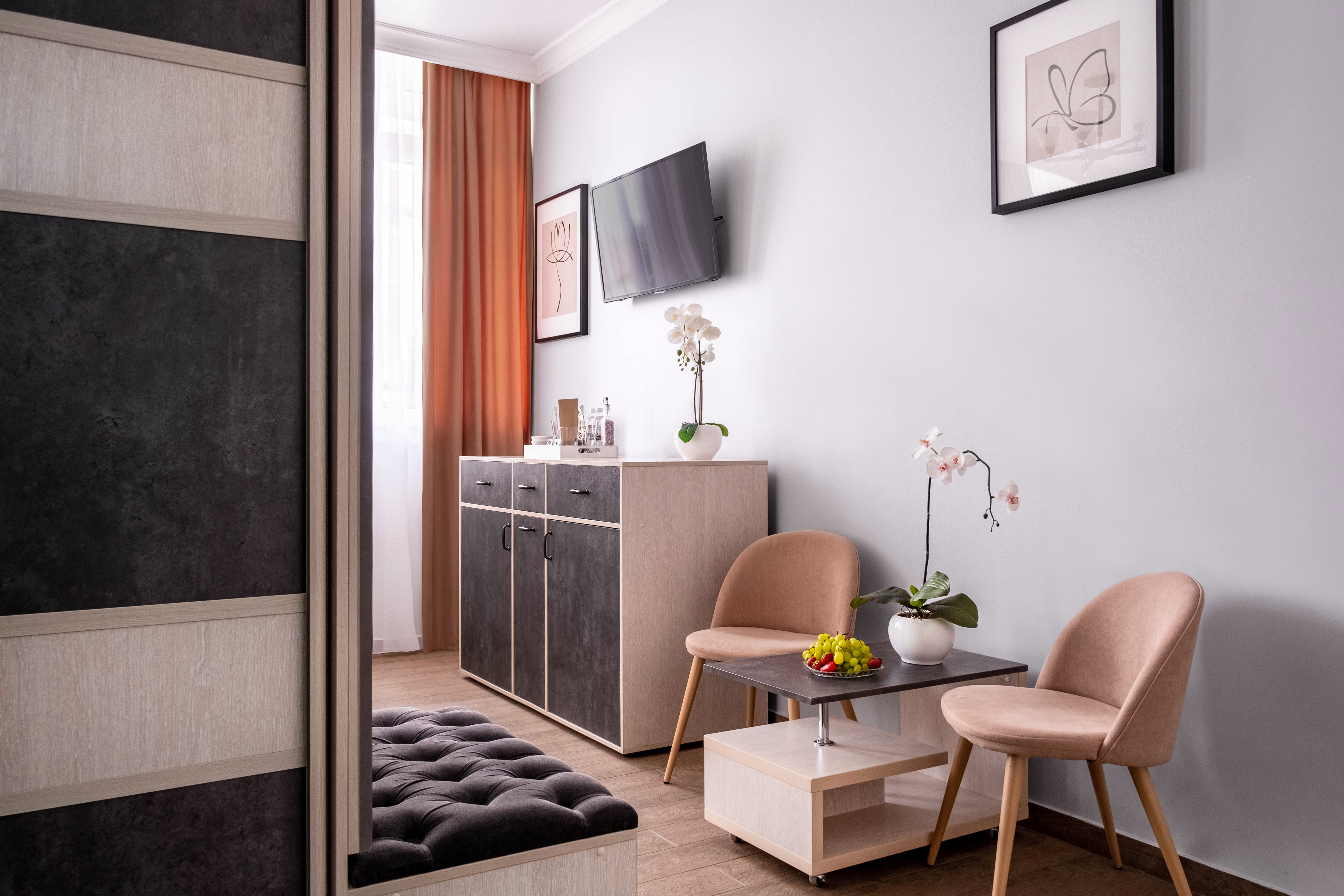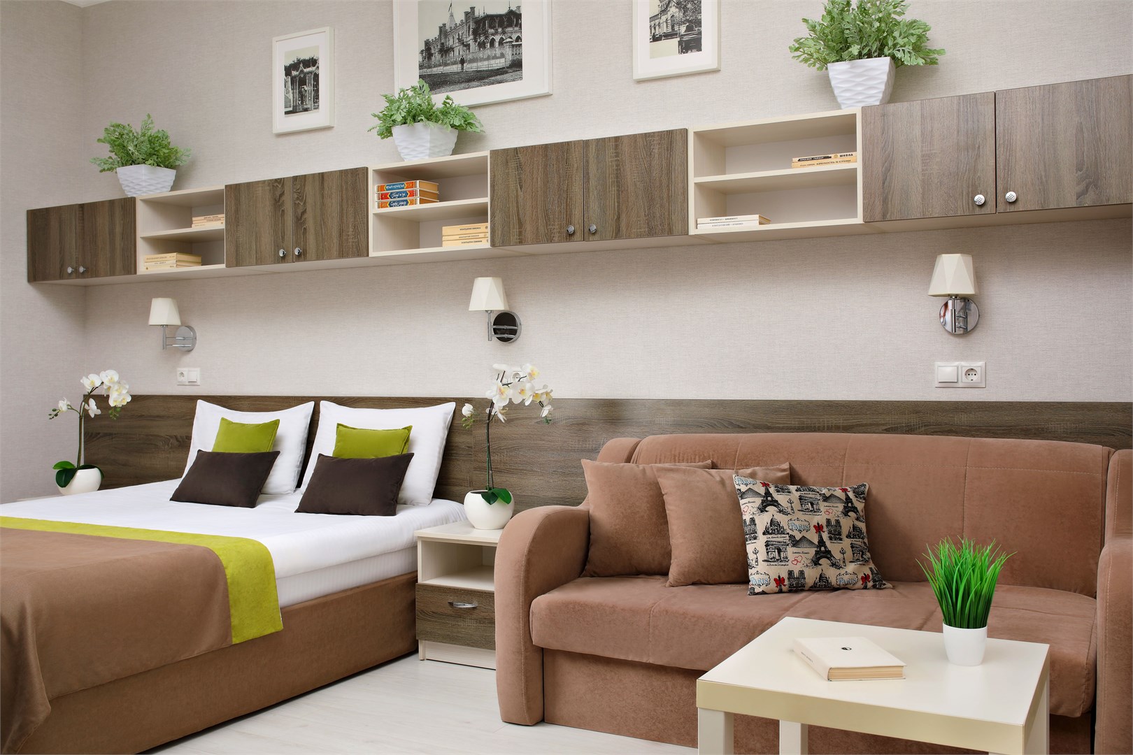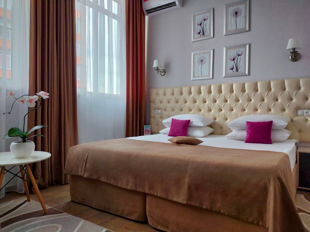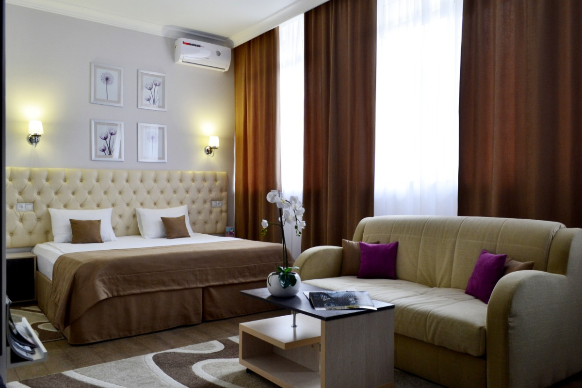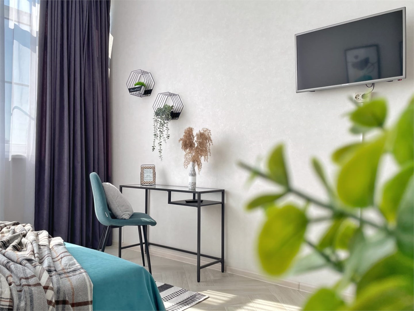 Гостей ожидают номера повышенной категории комфорта — Студио, Люкс и Апартаменты с кухней, расположенные в корпусе. И отдельный таунхаус, расположенный по адресу - ул. Маркова, 98. В номерах современный стильный интерьер, оформленный в пастельной цветовой гамме с использованием темных контрастных оттенков. В каждом номере есть санузел с туалетными принадлежностями, телевизор-ЖК, фен.