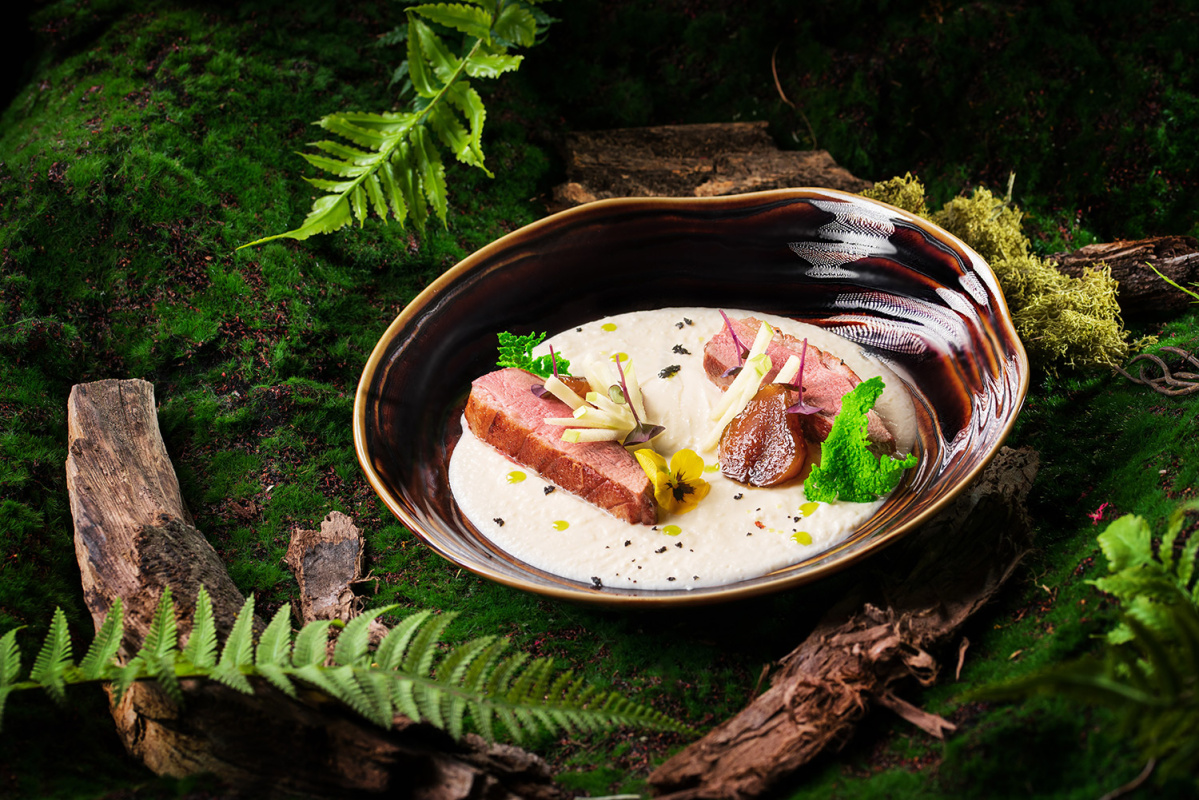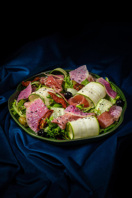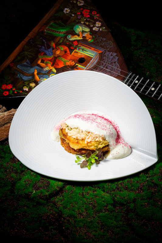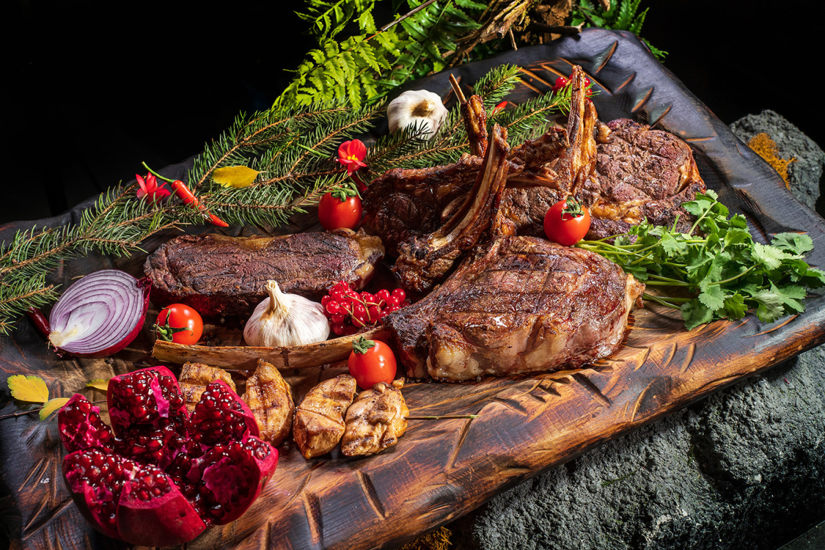 Завтрак проходит с 8:00 до 10:30. В остальное время ресторан работает по системе à la carte. В меню: авторские и традиционные кавказские блюда — осетинские пироги, хачапури, горячие блюда из мяса и рыбы, десерты. Проводятся гастрономические шоу с яркой подачей блюд — с бабочками, мини-фейерверками, жидким азотом.