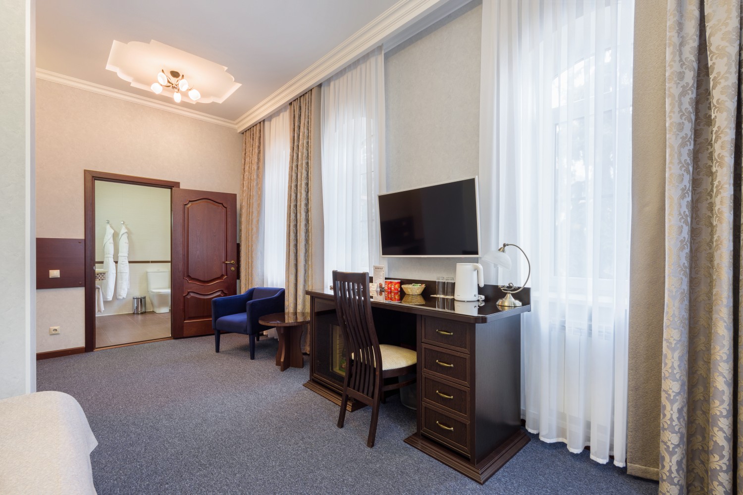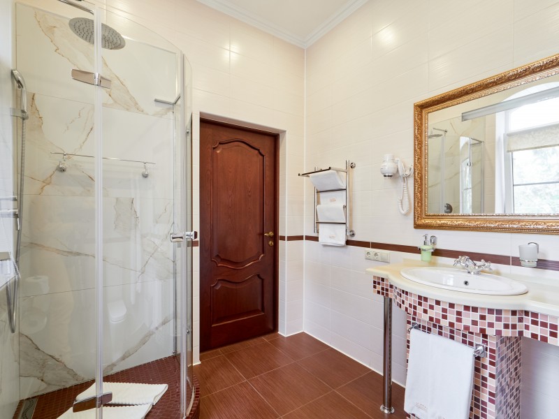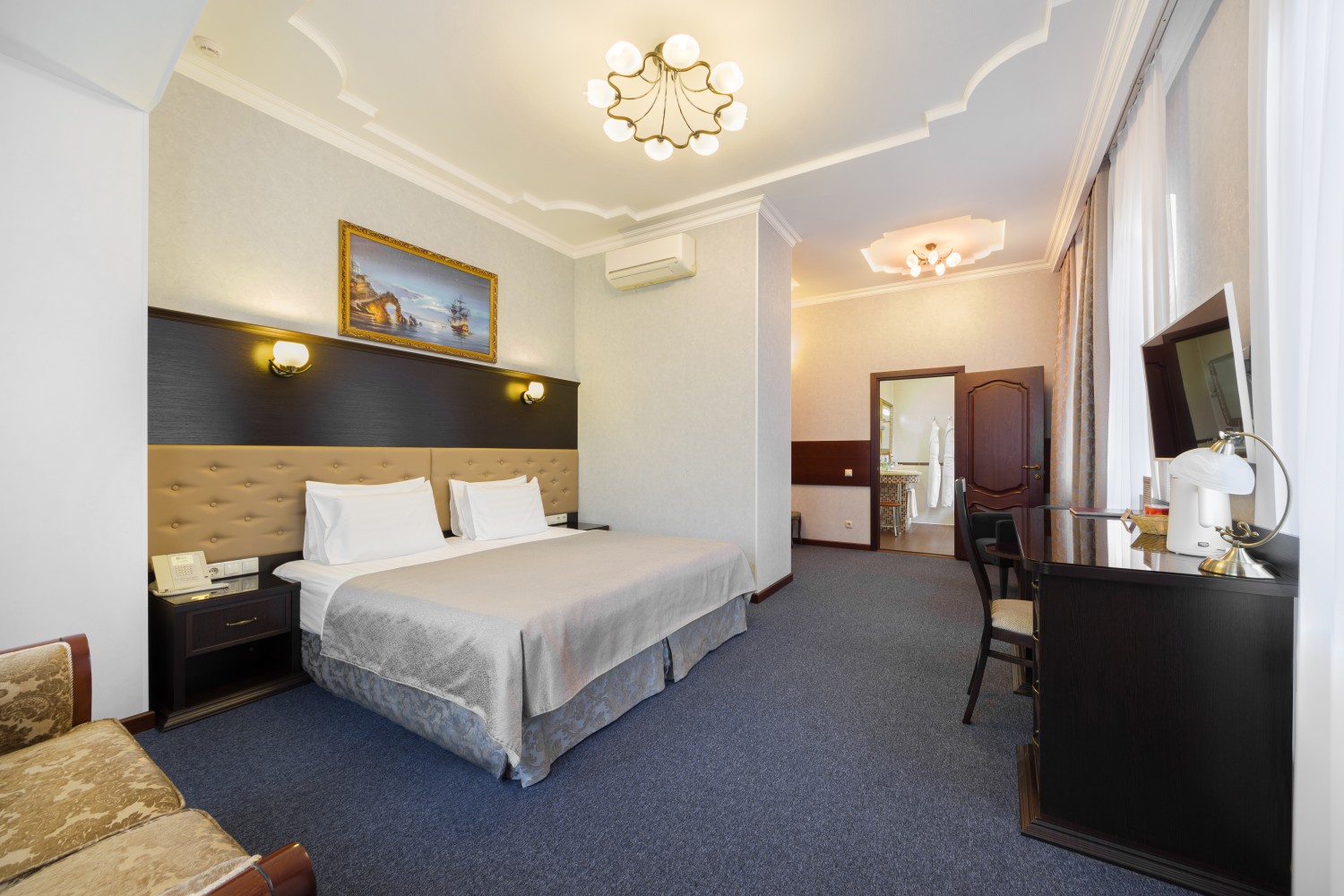 Просторные номера различных категорий — от уютных Стандартов до роскошных Апартаментов с кухней и джакузи. Интерьеры выполнены в классическом стиле, все номера оснащены современной техникой и всем необходимым для комфортного проживания: кондиционер, телевизор, мини-бар, фен, полотенца, халаты, тапочки.