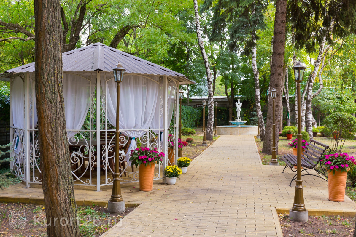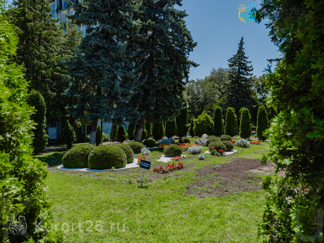 Санаторий стоит на 3 гектарах собственной территории, где растут голубые ели и туи. В благоустроенной парковой зоне есть пешеходные дорожки.