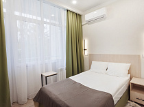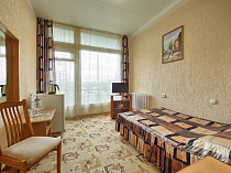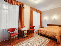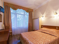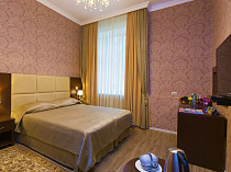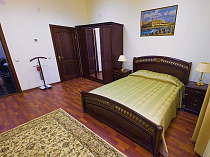 холодильник, телевизор, балкон, двуспальная кровать, шкаф, набор мягкой мебели, прикроватные тумбочки, электрочайник, стол, журнальный столик, посуда, санузел с ванной, комод с зеркалом