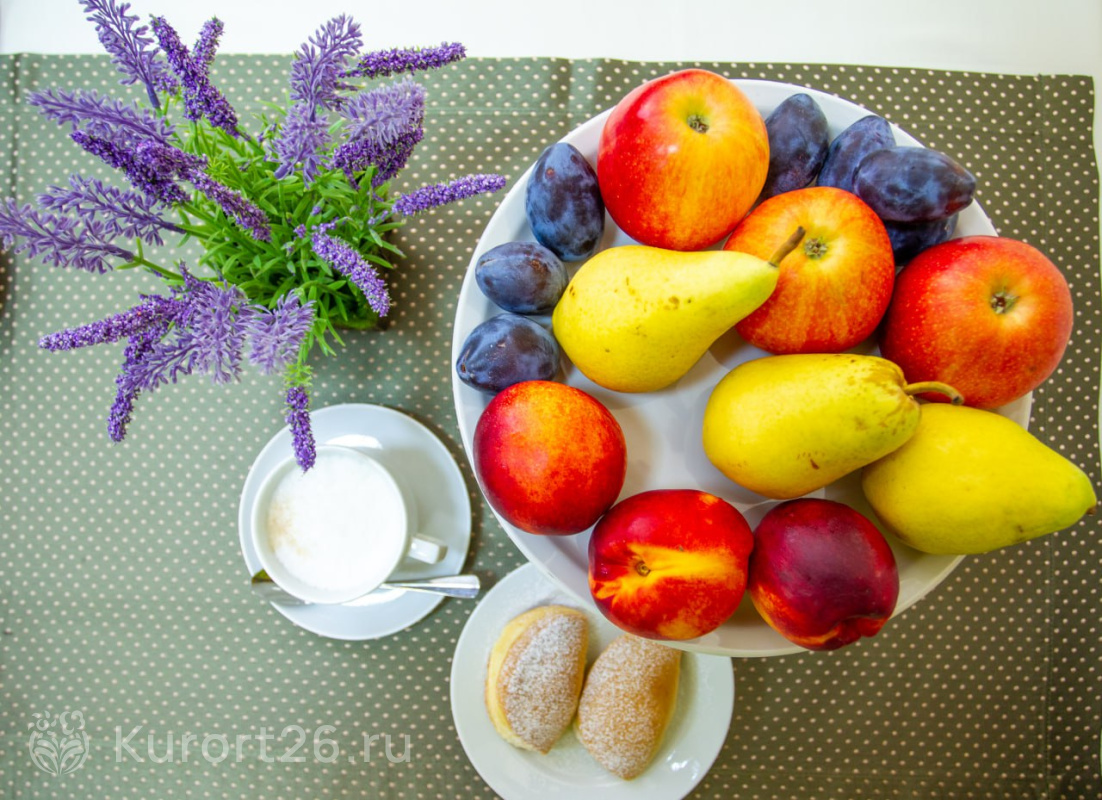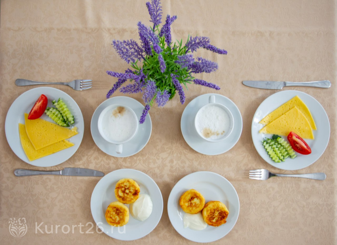 - Включено трёхразовое питание с элементами «шведского стола» (салаты, запеканка, омлет, блины, первые блюда). Гости отмечают, что питание диетическое, вкусное, в рацион включены овощи, фрукты