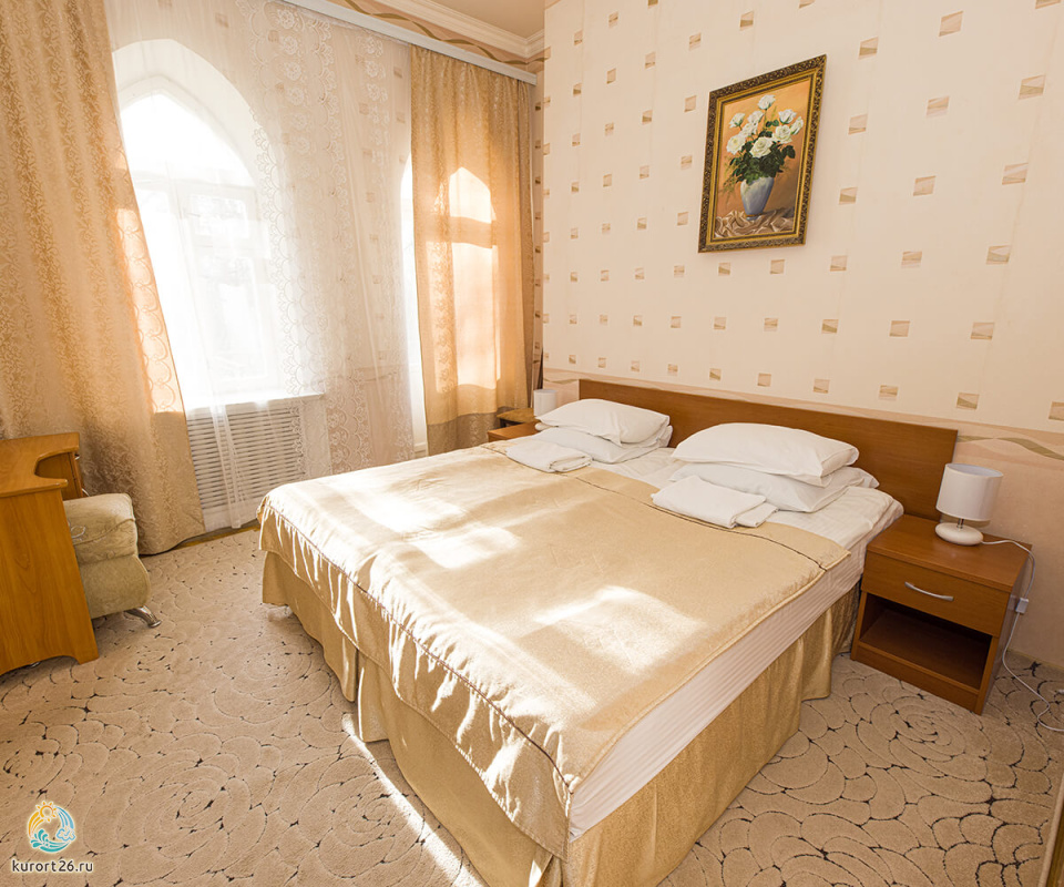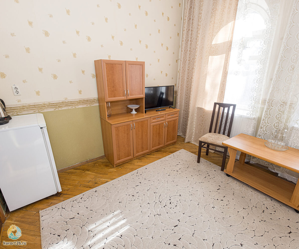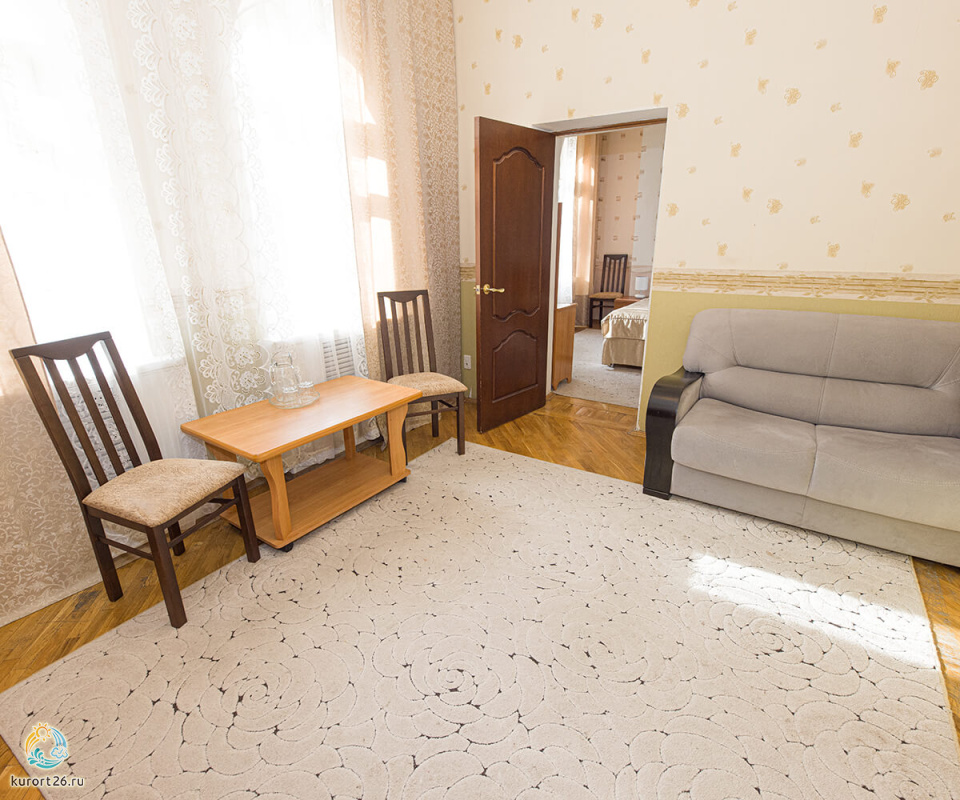 Люкс 2-местный 2-комнатный, площадь номера 32 кв.м., 2 основных места, 1 дополнительное место, в номере ванна, телевизор, холодильник, электрочайник, телефон, радио.