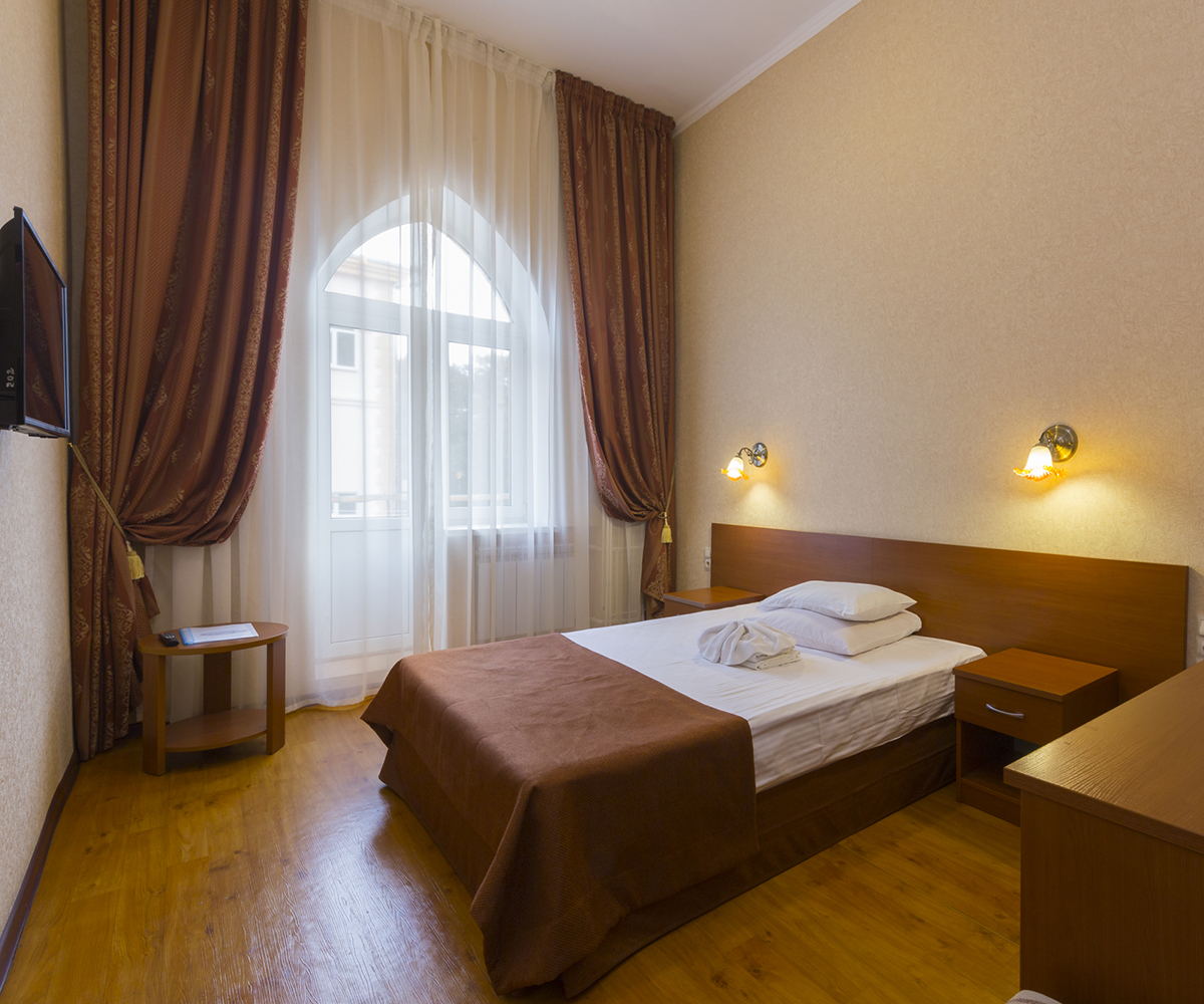холодильник, телевизор, фен, набор чайной посуды, телефон, ванные принадлежности, шкаф, прикроватные тумбочки, односпальная кровать, электрочайник, ванная комната