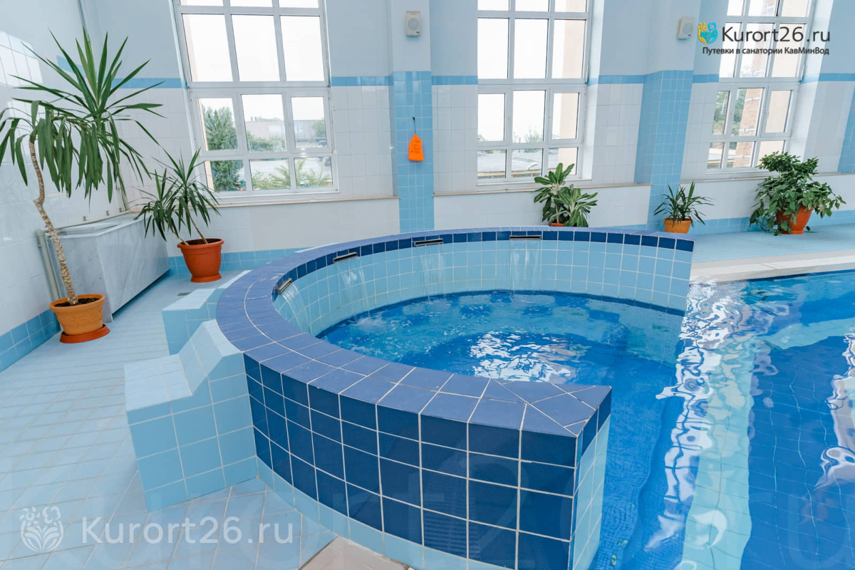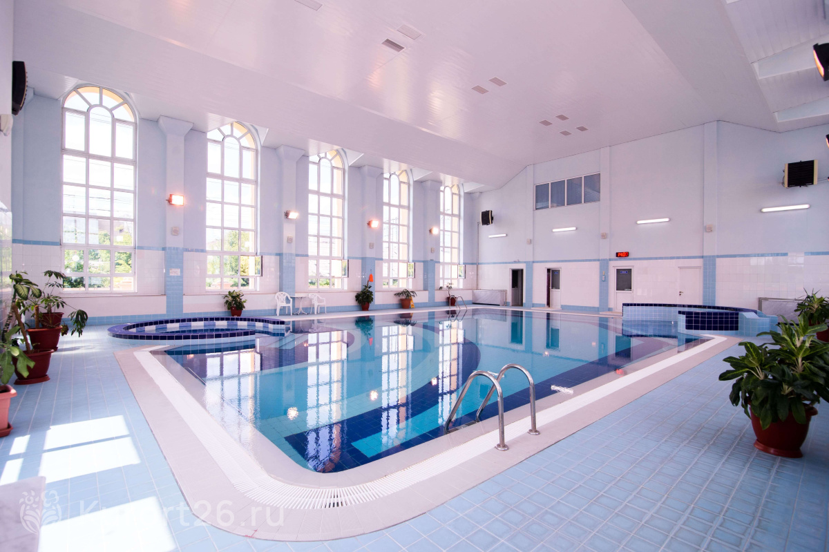 В санатории работает крытый бассейн 15х10 метров, глубиной 1,2–1,8 метра. Вода проходит многоступенчатую очистку с ультрафиолетовой обработкой. Бассейн оборудован гидромассажем, что позволяет гостям расслабиться после активного дня. Панорамные окна наполняют пространство светом, открывают вид на живописные окрестности.
