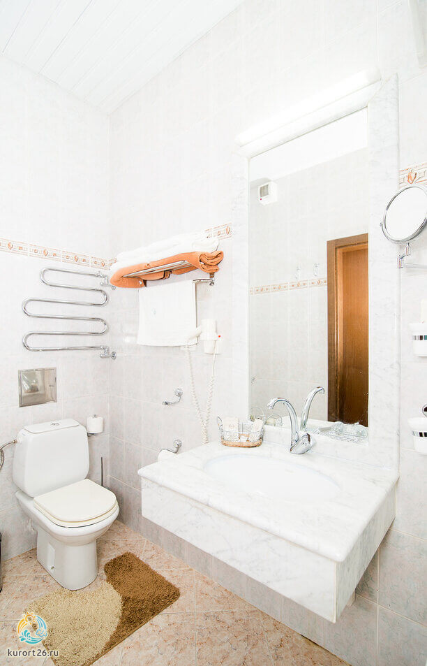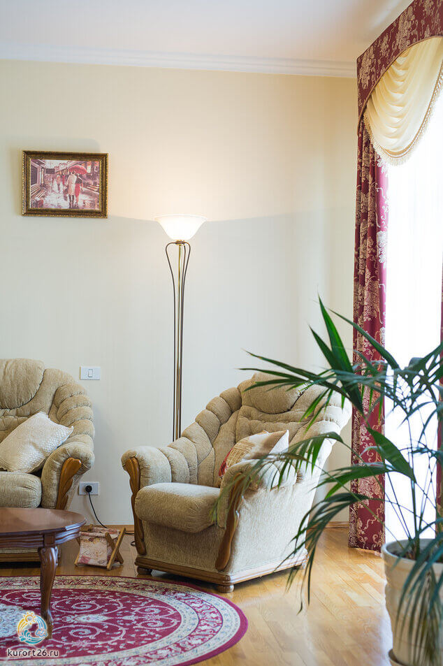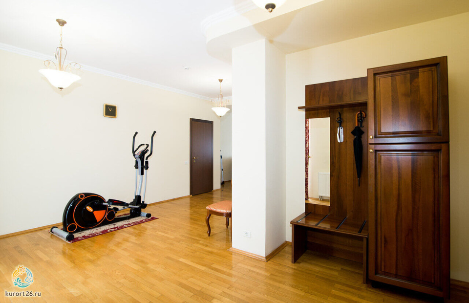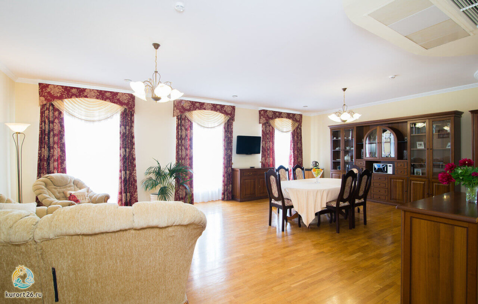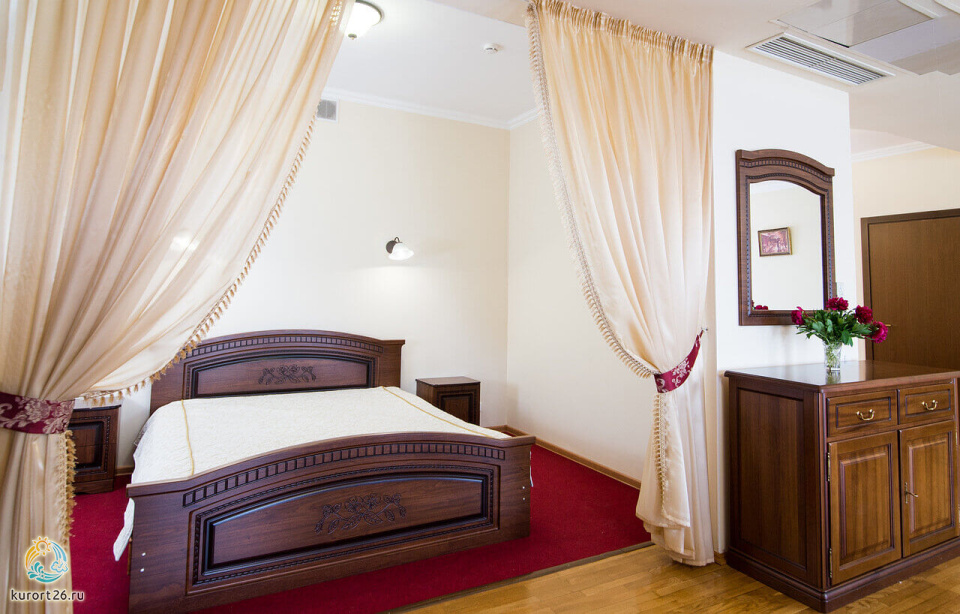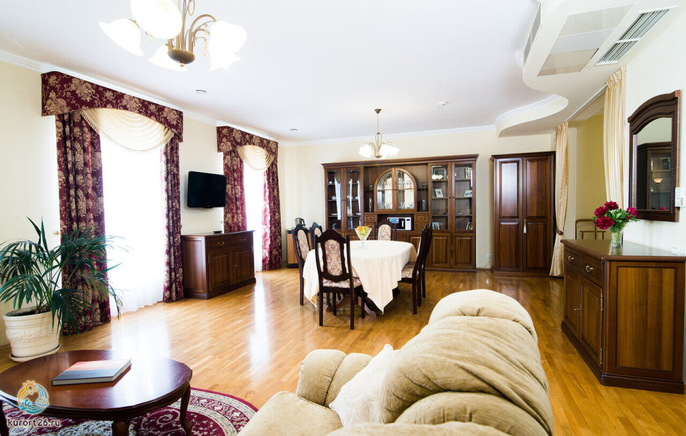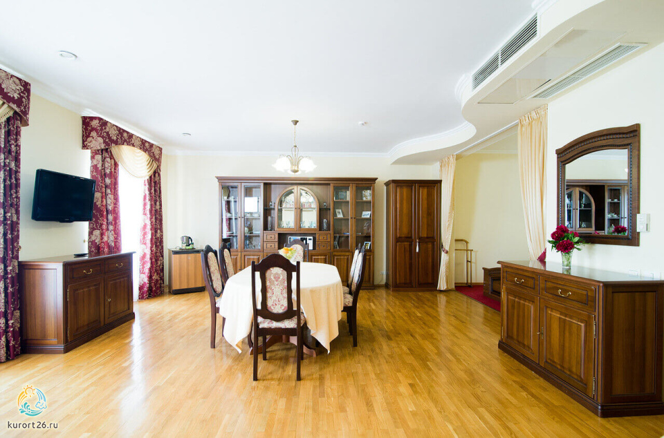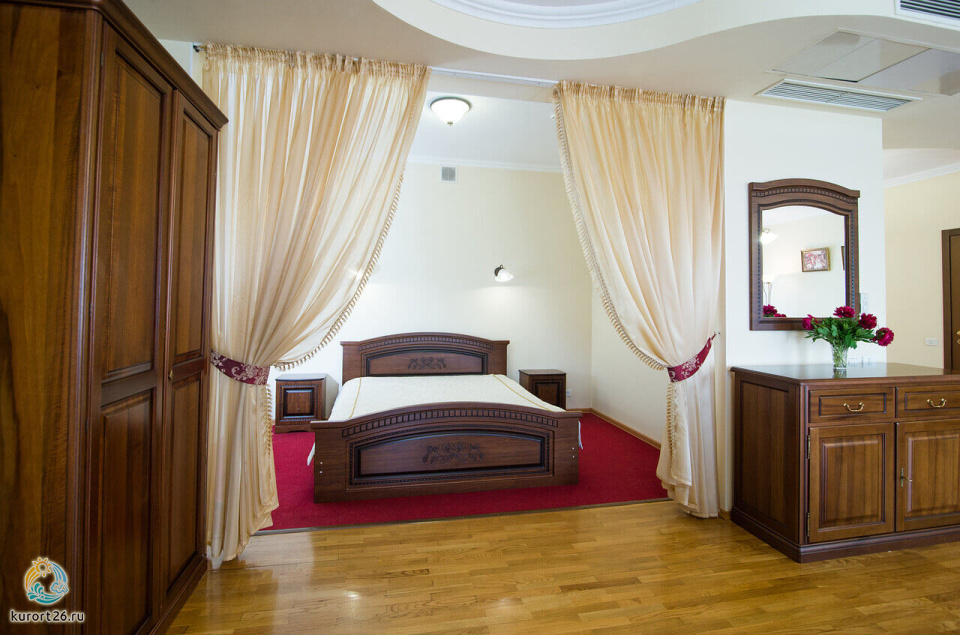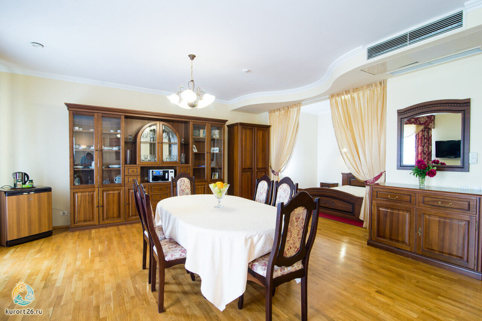 Апартамент однокомнатный двухместный включает: двуспальную кровать, прикроватные тумбочки, шкаф, стол, холодильник, телевизор, музыкальный центр, сейф, шаговую дорожку. В номере своя ванная комната с джакузи и ванными принадлежностями.