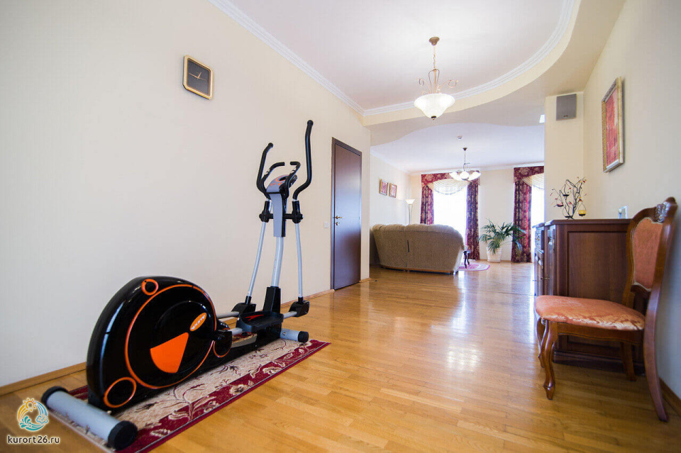 холодильник, кондиционер, телевизор, чайник, фен, набор чайной посуды, балкон, сейф, телефон, санузел с душевой кабиной, ванная комната, тренажёр шаговый, джакузи, двуспальная кровать / две односпальные кровати