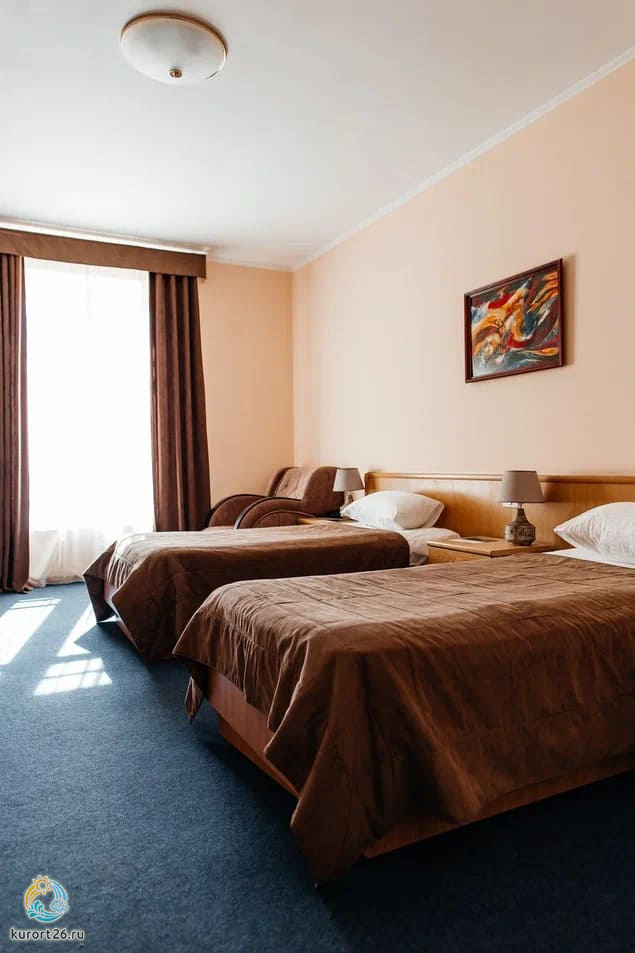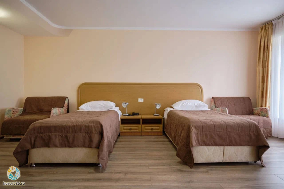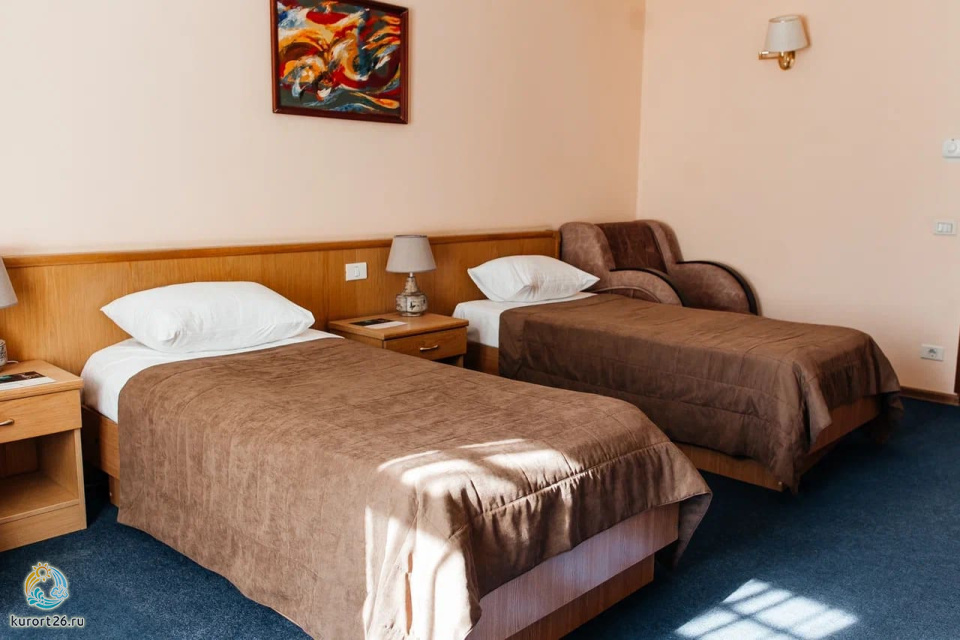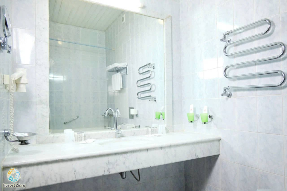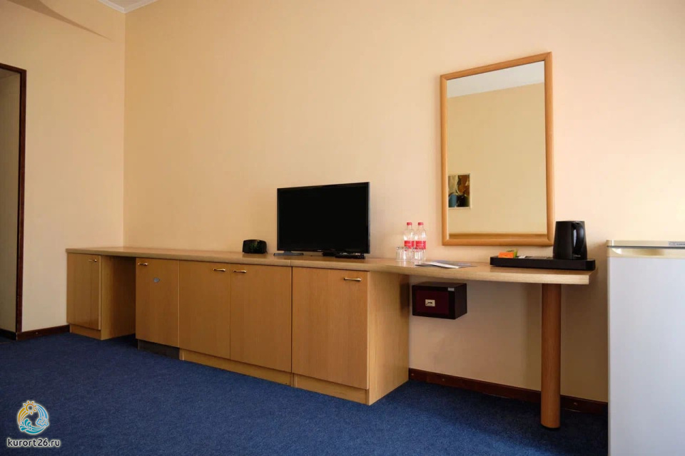 холодильник, телевизор, чайник, фен, набор чайной посуды, сейф, телефон, мини-бар, санузел с душевой кабиной, ванные принадлежности, халат, тапочки, двуспальная кровать / две односпальные кровати