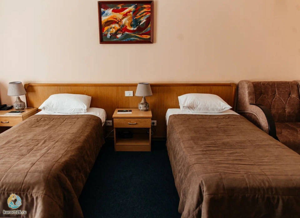 холодильник, телевизор, чайник, фен, набор чайной посуды, балкон, сейф, телефон, ванные принадлежности, ванная комната, две односпальные кровати
