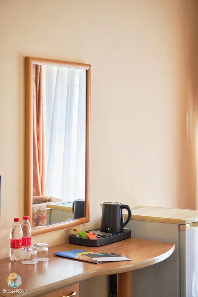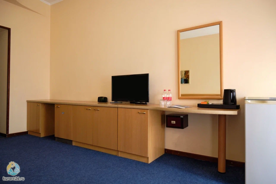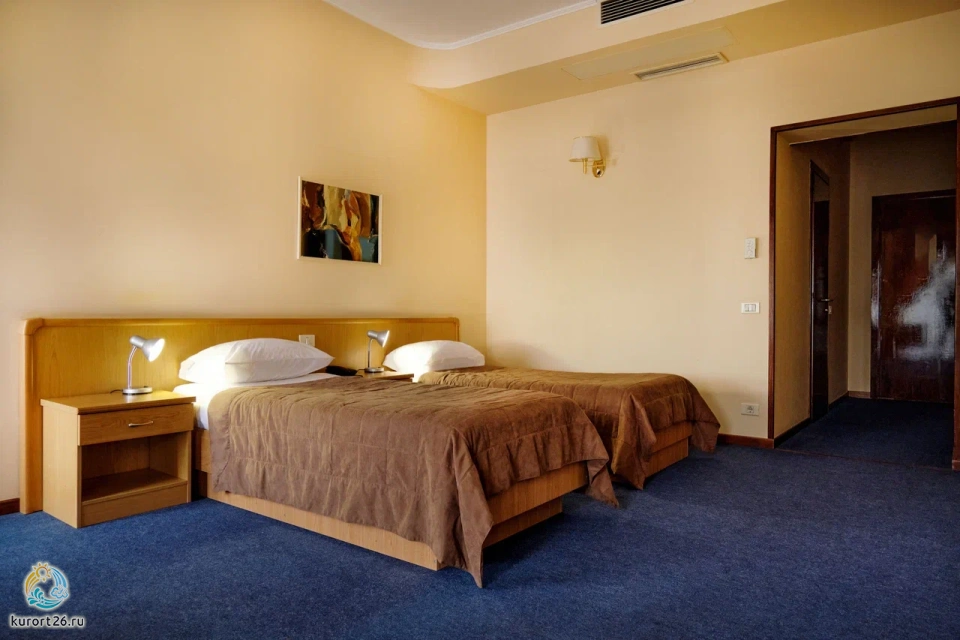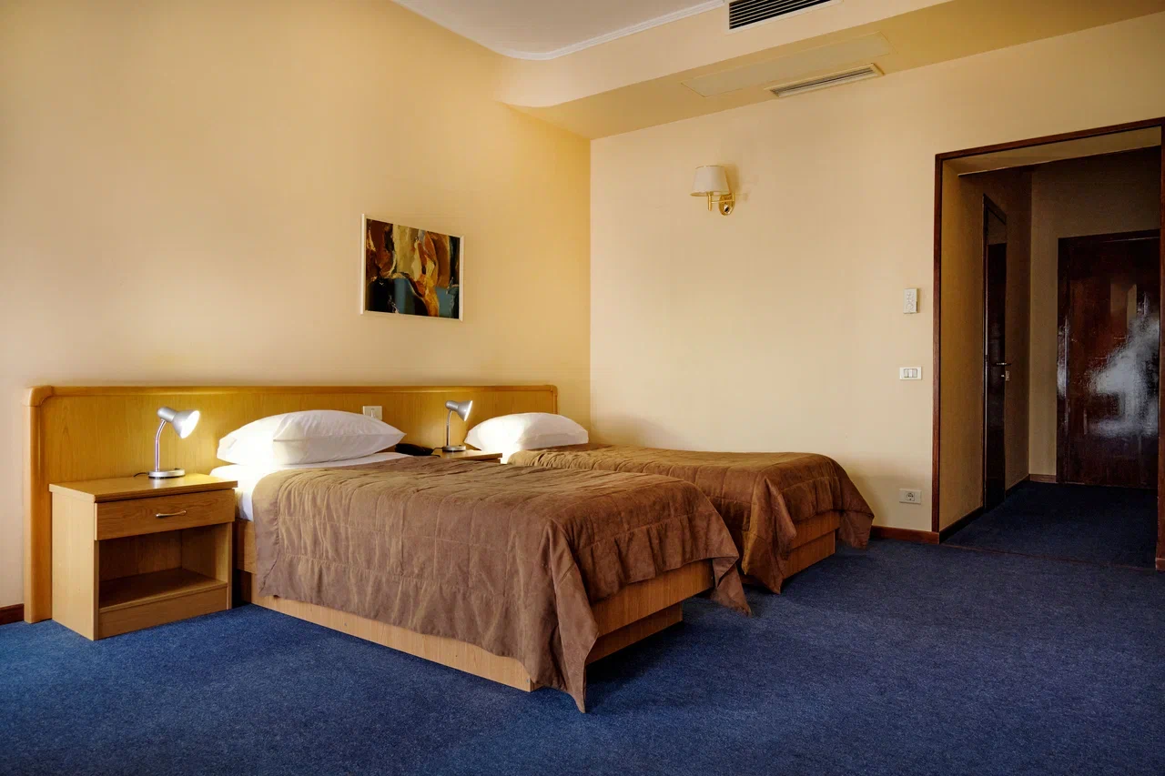 Номер Стандарт включает: две односпальные кровати, холодильник, сейф, телефон, набор чайной посуды и электрочайник. В ванной комнате: ванные принадлежности и фен.