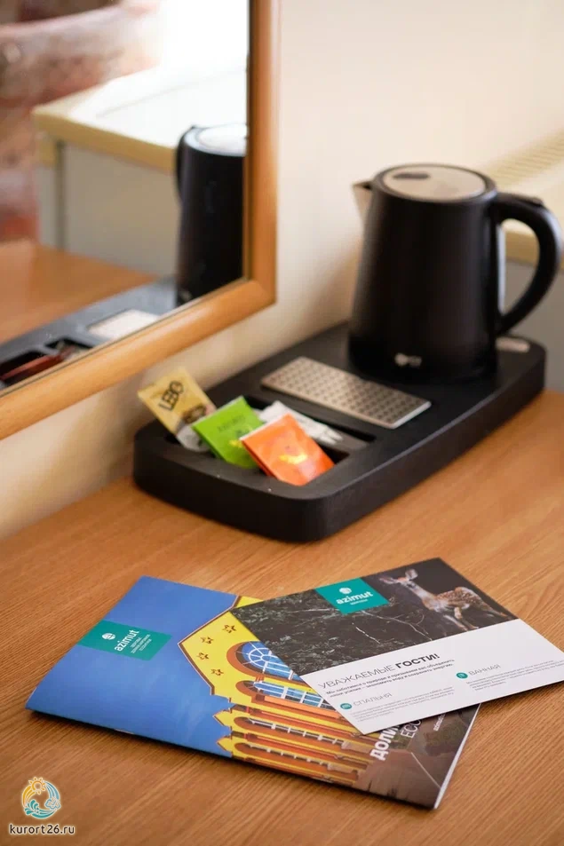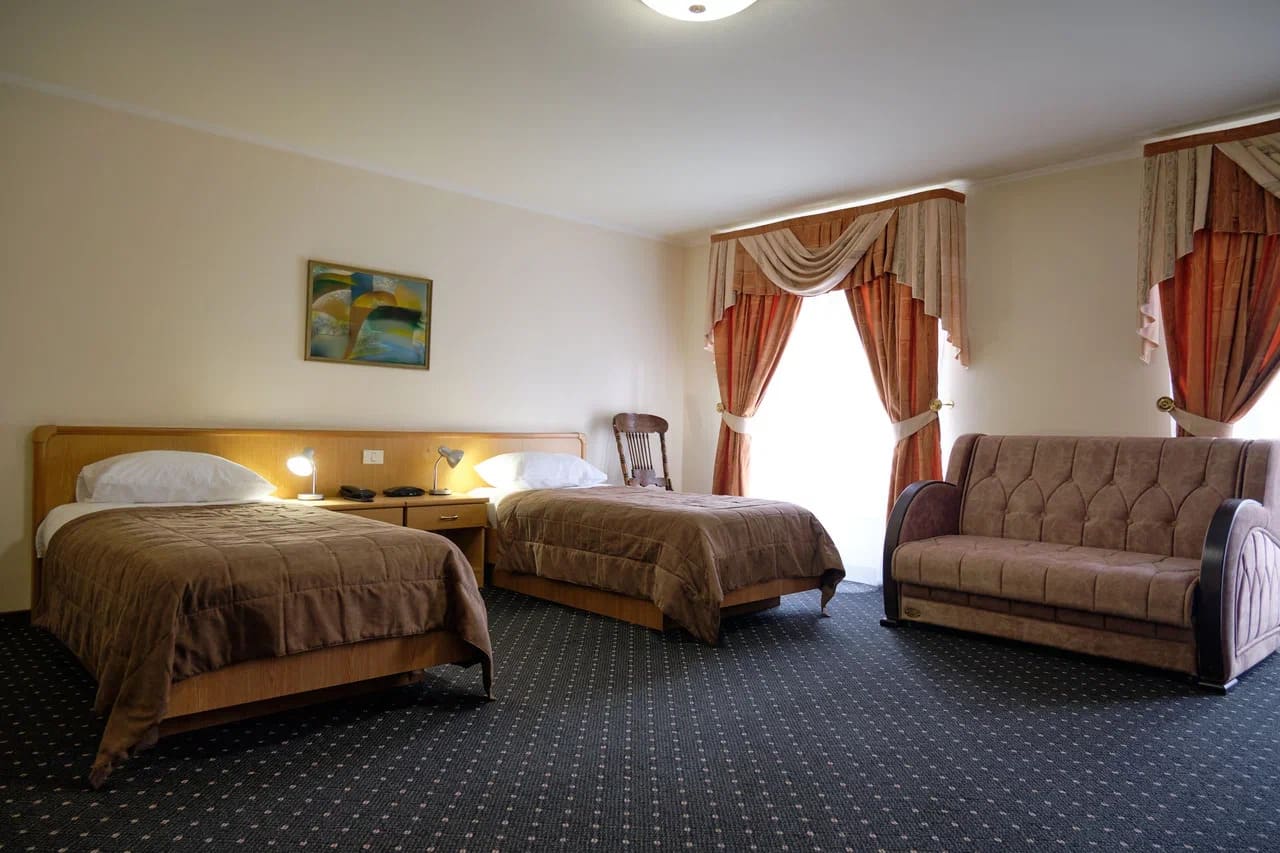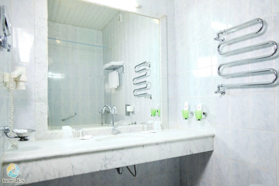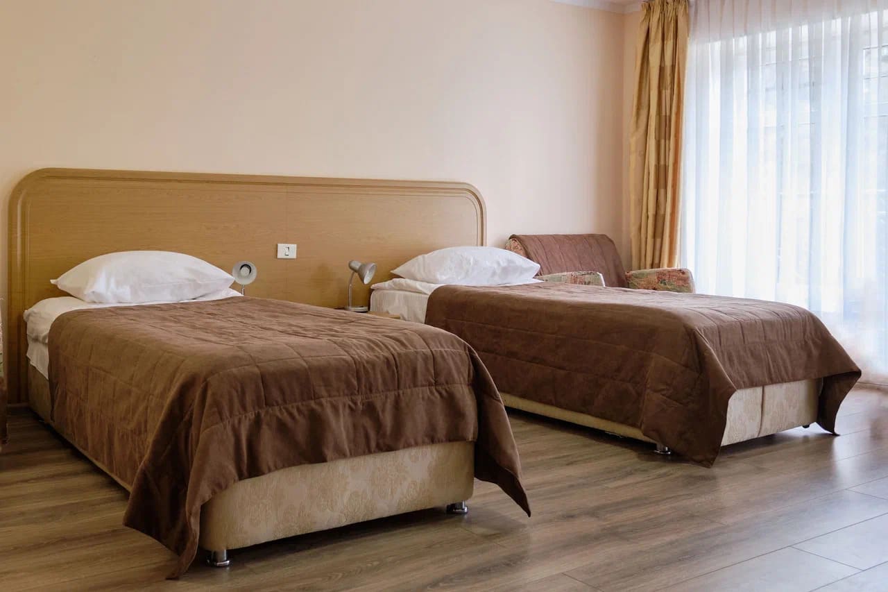Номер Стандарт включает: две односпальные кровати, холодильник, сейф, телефон, набор чайной посуды и электрочайник. В ванной комнате: ванные принадлежности и фен.