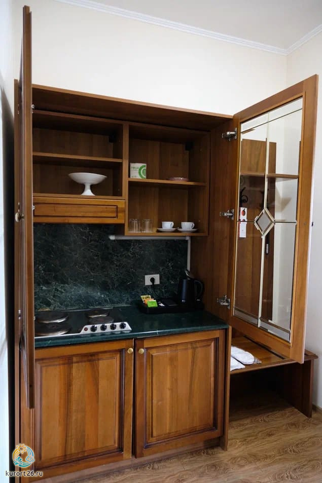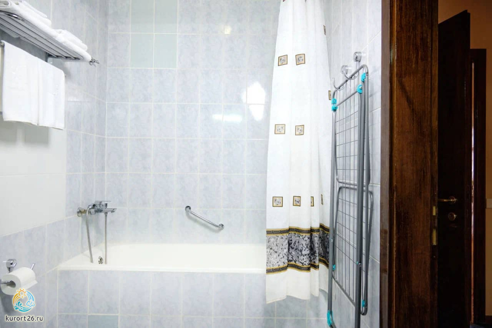 холодильник, телевизор, чайник, фен, набор чайной посуды, сейф, телефон, мини-бар, санузел с душевой кабиной, ванные принадлежности, халат, тапочки, двуспальная кровать / две односпальные кровати