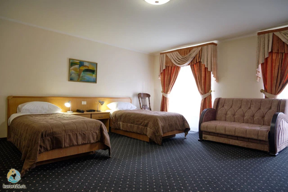 холодильник, телевизор, чайник, фен, набор чайной посуды, сейф, телефон, мини-бар, санузел с душевой кабиной, ванные принадлежности, халат, тапочки, двуспальная кровать / две односпальные кровати
