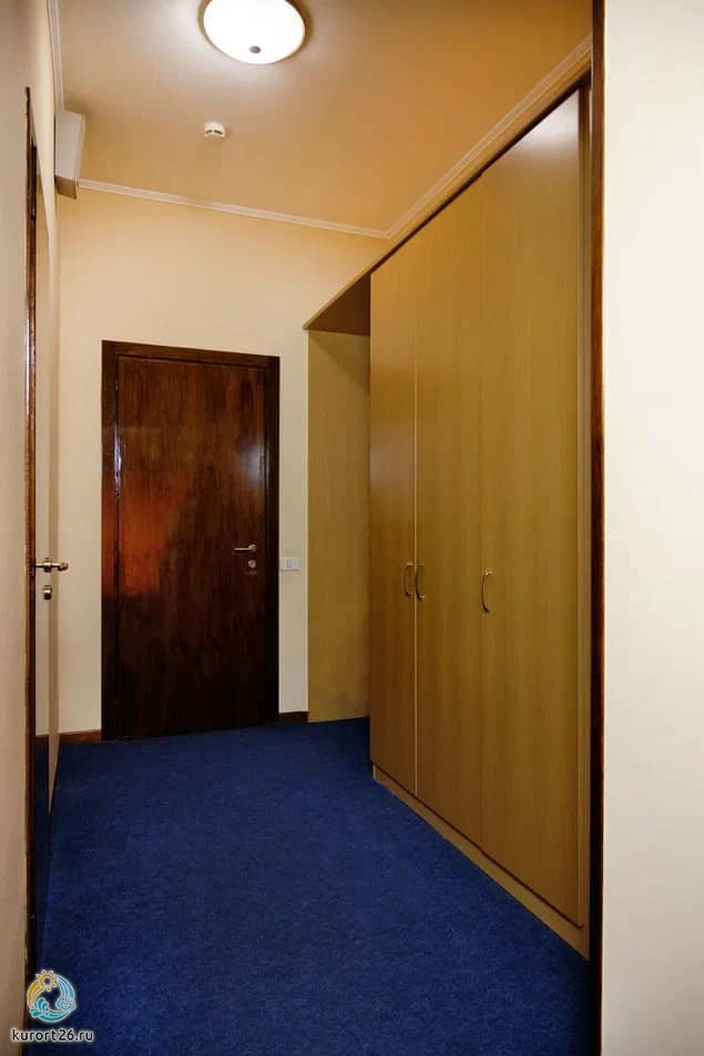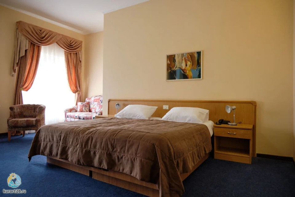 Сюит двухкомнатный двухместный включает: двуспальную кровать, прикроватные тумбочки, стол, шаговую дорожку, два телевизора, сейф. Кухонная зона содержит холодильник, кофемашину, микроволновую печь, набор чайной посуды и электрочайник. В номере две ванные комнаты — с душевой кабиной и ванной с системой джакузи, есть ванные принадлежности, фен.