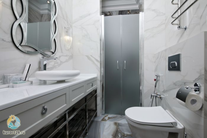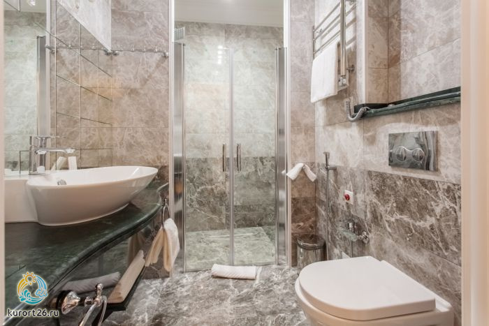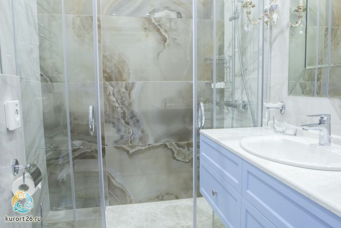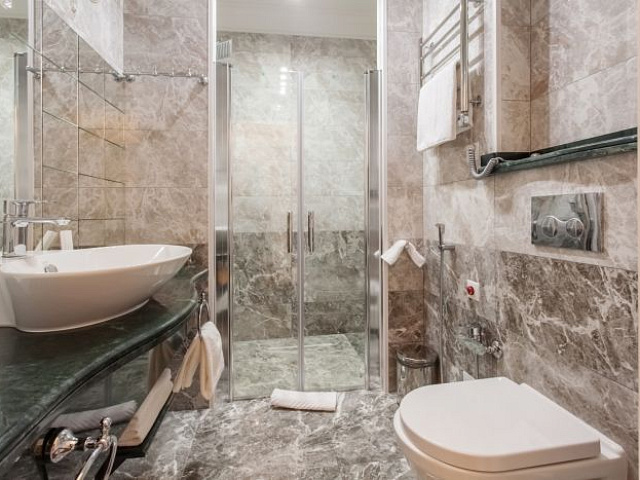 Просторная ванная комната оснащена отдельной душевой кабиной, располагающей к безмятежному отдыху. К вашим услугам умывальник с большим и удобным зеркалом, комплект туалетно-косметических принадлежностей, фен. Мы делаем всё, чтобы вы почувствовали полное расслабление.