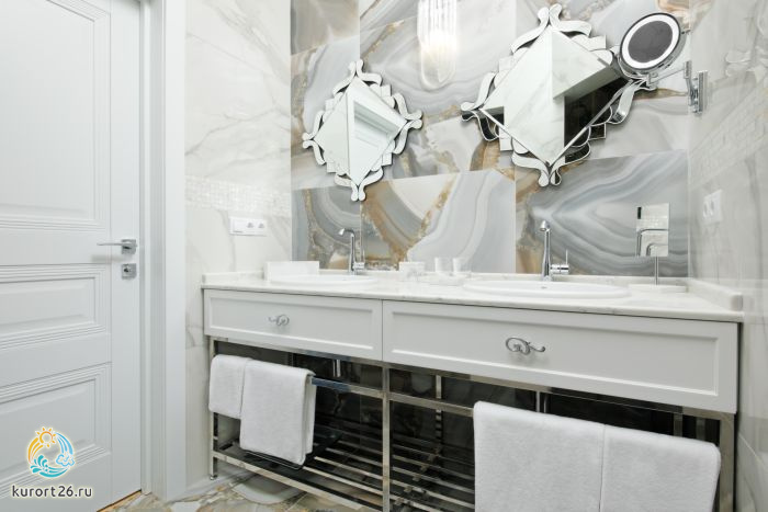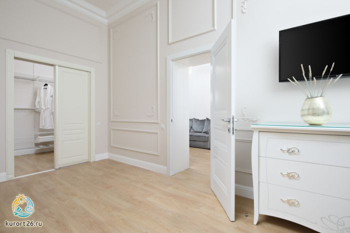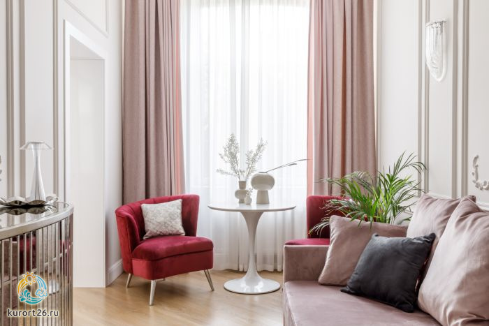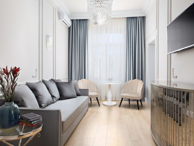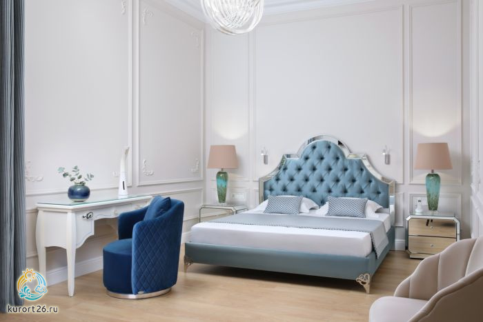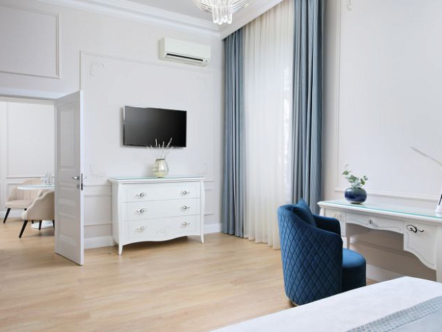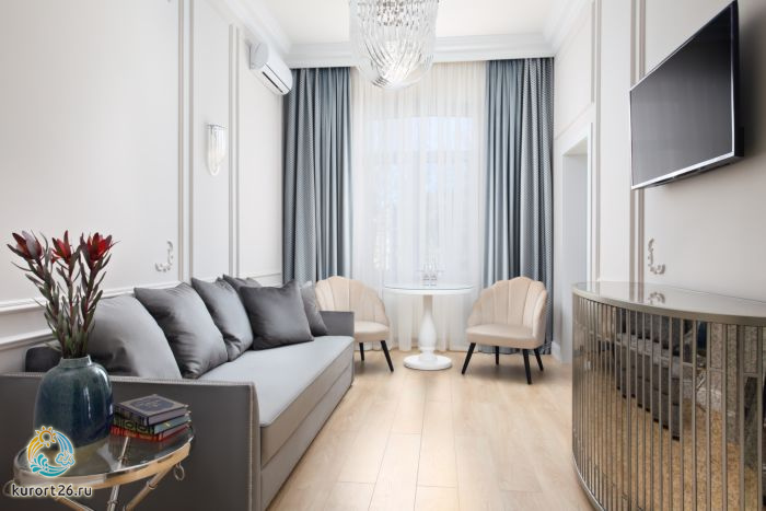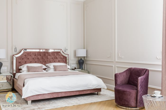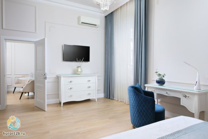 Изысканный и просторный двухкомнатный номер с большой двуспальной кроватью, гостиной, просторной ванной комнатой и гардеробной.