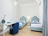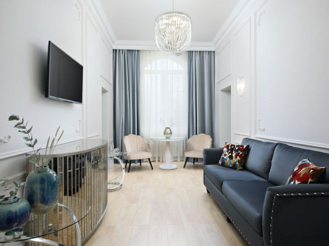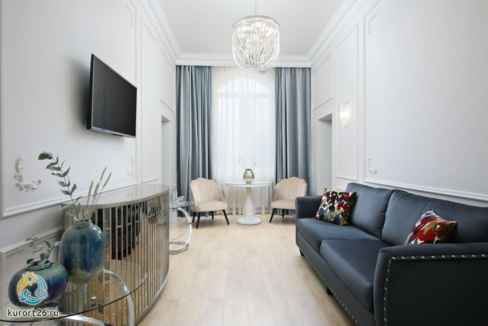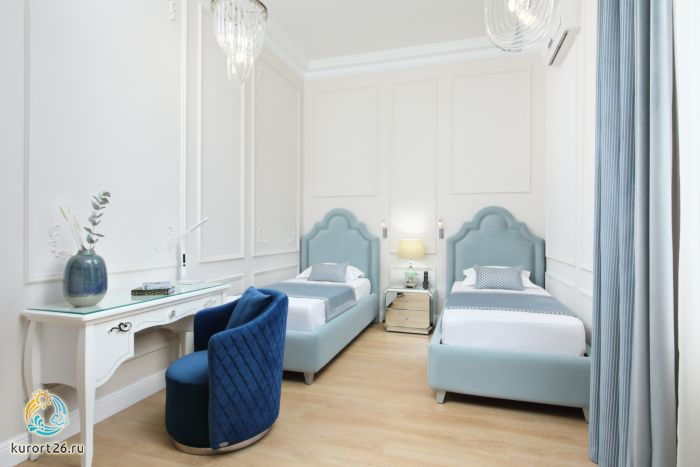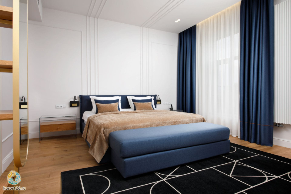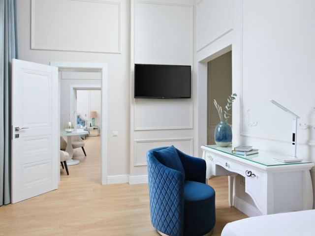 К услугам гостей трехкомнатный номер с двуспальной кроватью, зонированый на три части: спальную зону, гостиную и личный кабинет. Все элегантные номера оснащены кондиционером с индивидуальным управлением, сейфом, плазменными панелями, расположенными в каждой комнате, мягкой мебелью в гостиной и кабинете.