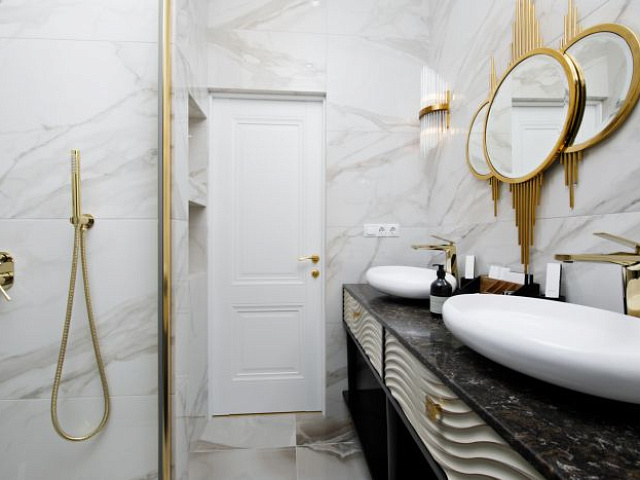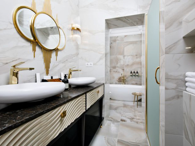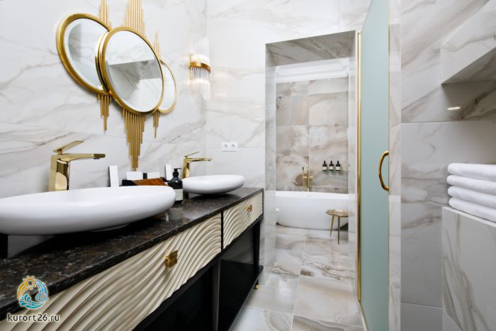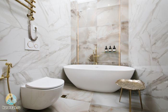 кондиционер, сейф, телефон, мини-бар, ванные принадлежности, халат, тапочки, ванна, кофемашина, два телевизора, чайный набор, биде