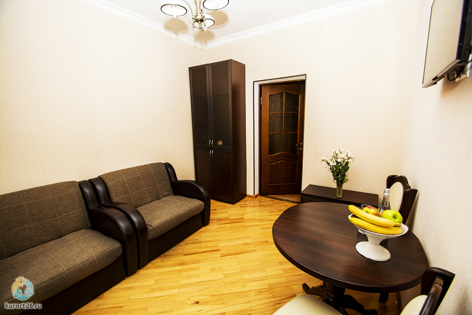 холодильник, кондиционер, телевизор, фен, телефон, двуспальная кровать, шкаф, две прикроватные тумбочки, диван, журнальный столик, санузел с ванной или душевой кабиной