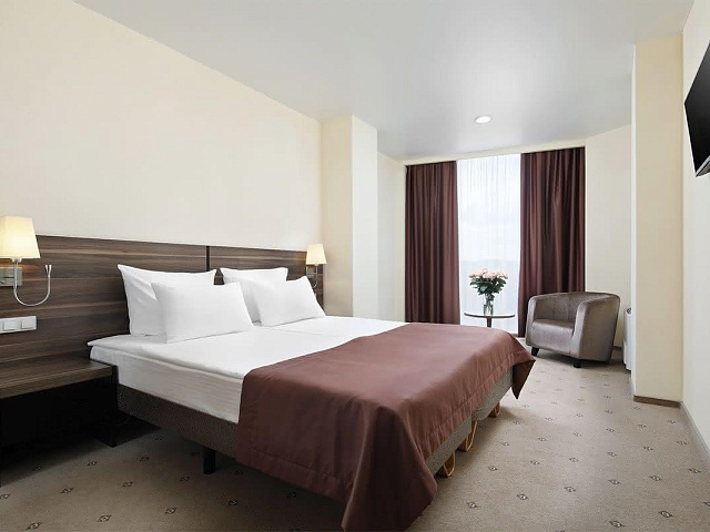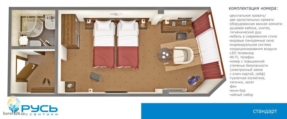 кондиционер, фен, сейф, телефон, интернет в номере, ванные принадлежности, халат, тапочки, электрочайник, два телевизора, посуда, Рабочая зона с письменным столом и удобным стулом, Душевая кабина, чайный набор, биде, мини-холодильник