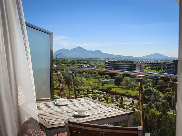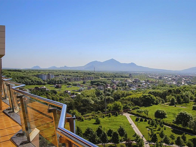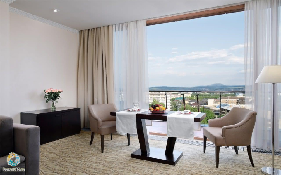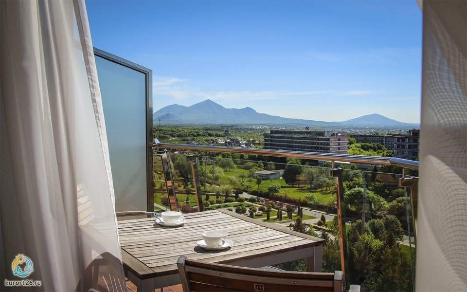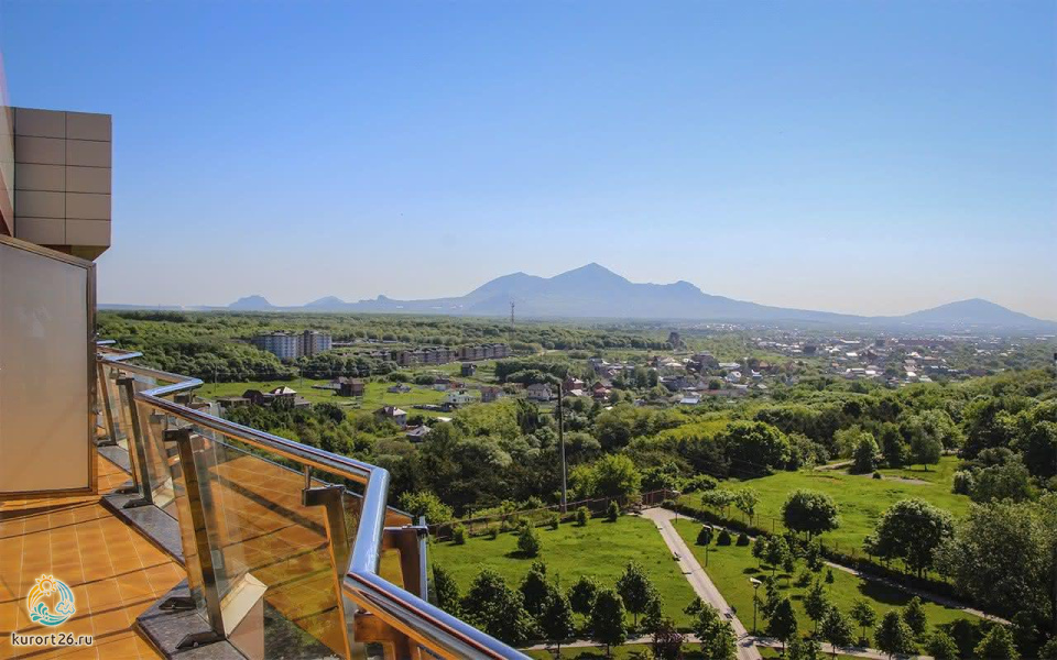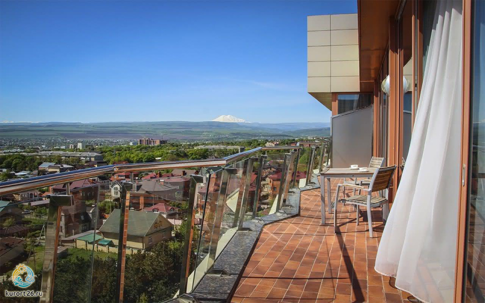 Вид из окон: С балкона номера открывается потрясающий вид на юг – цепь сверкающих горных вершин, среди которых возвышается легендарный царственный Эльбрус.