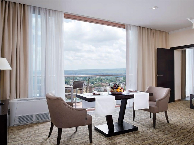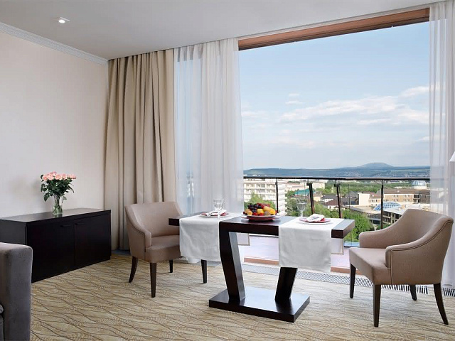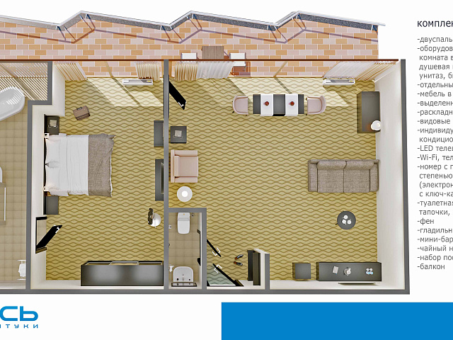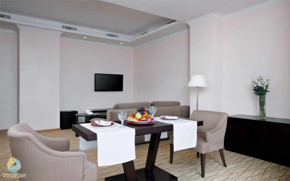 Особенности номера: двухкомнатный номер, состоящий из уютной гостиной и комфортабельной спальни. Есть выход на балкон. Номер оборудован двумя раздельными санузлами.