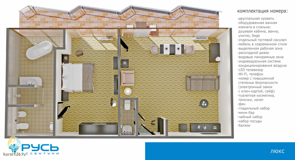 кондиционер, фен, сейф, телефон, интернет в номере, ванные принадлежности, халат, тапочки, электрочайник, два телевизора, посуда, Рабочая зона с письменным столом и удобным стулом, Душевая кабина, чайный набор, биде, мини-холодильник