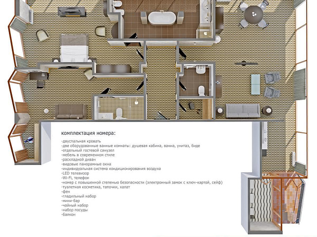 кондиционер, фен, сейф, телефон, интернет в номере, санузел с душевой кабиной, ванные принадлежности, халат, тапочки, электрочайник, ванна, два телевизора, посуда, Рабочая зона с письменным столом и удобным стулом, чайный набор, гостевой санузел, биде, мини-холодильник