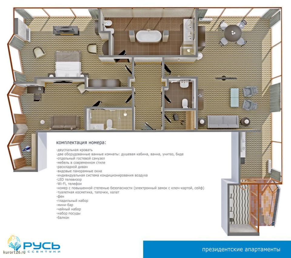 кондиционер, фен, сейф, телефон, интернет в номере, ванные принадлежности, халат, тапочки, электрочайник, весы напольные, три телевизора, посуда, чайный набор, две ванные комнаты с ванной и душевой кабиной, гостевой санузел, биде, мини-холодильник