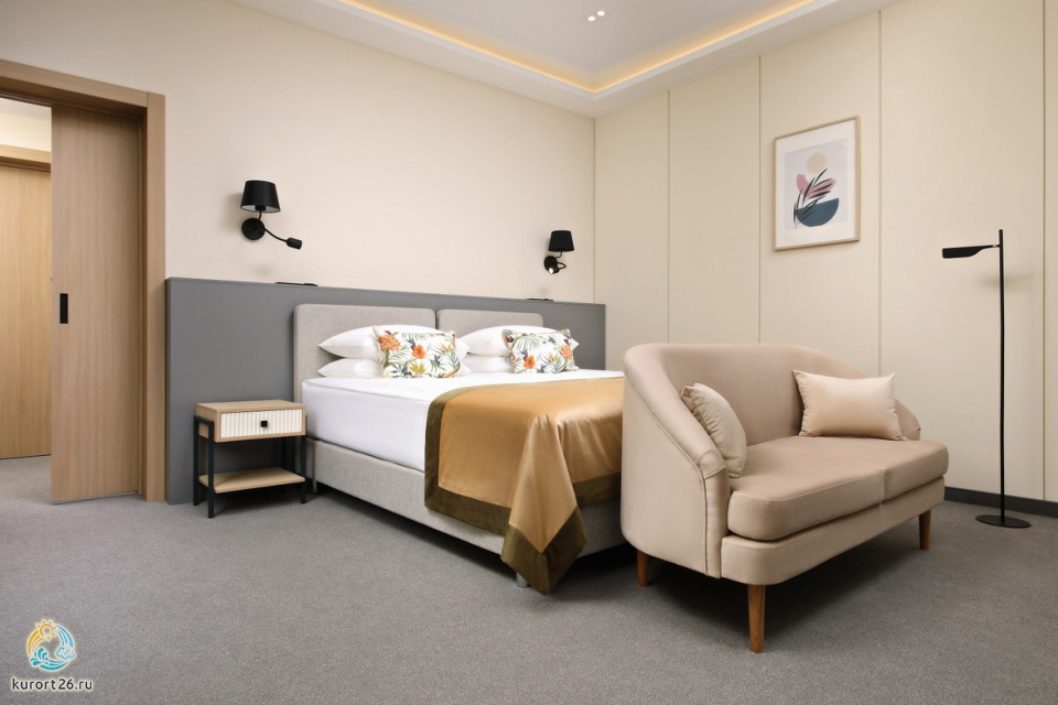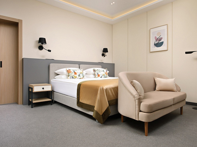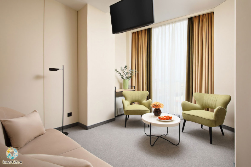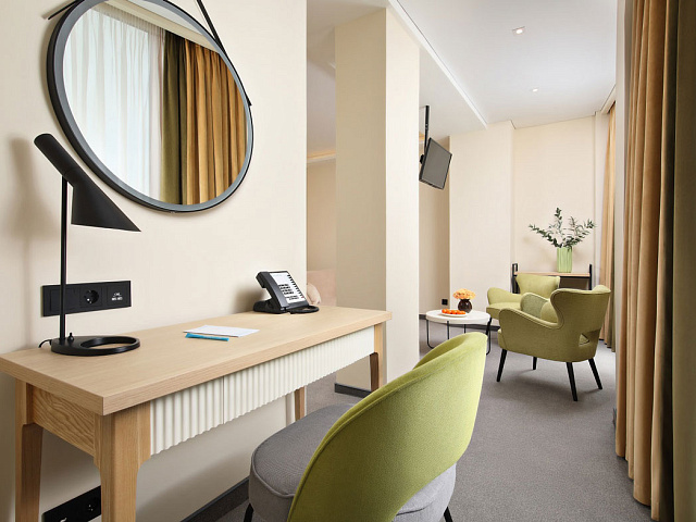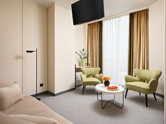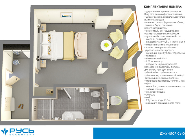 кондиционер, телевизор, фен, сейф, телефон, интернет в номере, ванные принадлежности, халат, тапочки, диван, электрочайник, посуда, Рабочая зона с письменным столом и удобным стулом, ванная комната с душевой кабиной, чайный набор, биде, мини-холодильник
