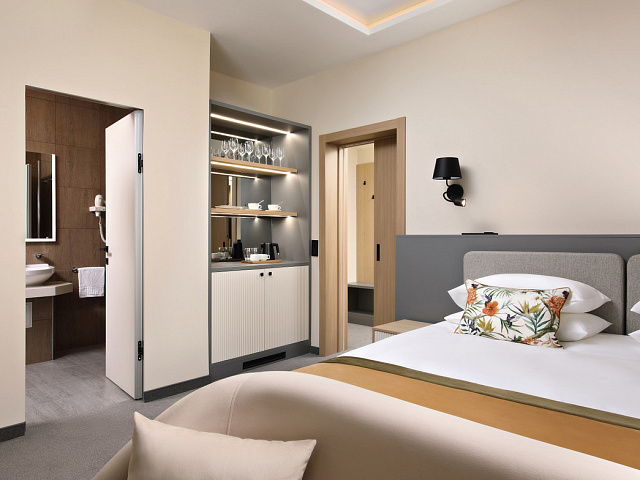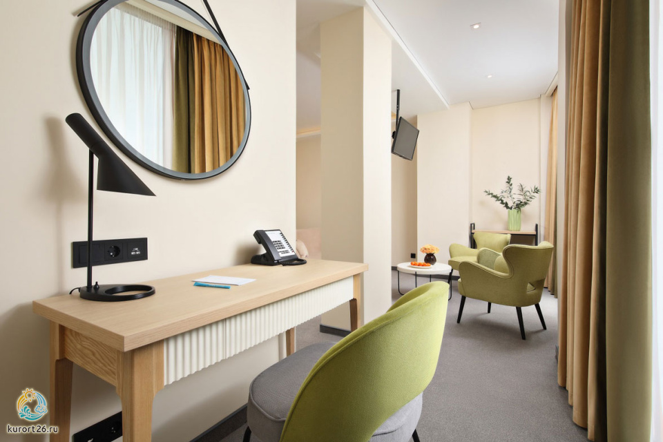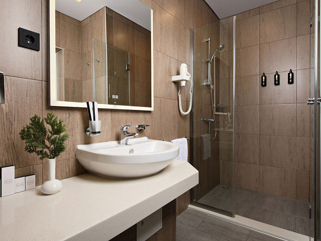 кондиционер, фен, сейф, телефон, интернет в номере, ванные принадлежности, халат, тапочки, электрочайник, два телевизора, посуда, Рабочая зона с письменным столом и удобным стулом, Душевая кабина, чайный набор, биде, мини-холодильник