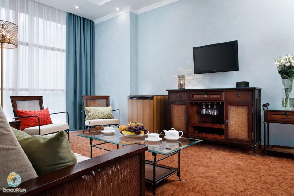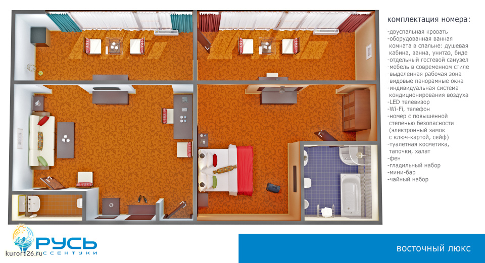 кондиционер, фен, сейф, телефон, интернет в номере, санузел с душевой кабиной, ванные принадлежности, халат, тапочки, электрочайник, ванна, два телевизора, посуда, Рабочая зона с письменным столом и удобным стулом, чайный набор, гостевой санузел, биде, мини-холодильник