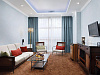 кондиционер, телевизор, фен, сейф, телефон, интернет в номере, ванные принадлежности, халат, тапочки, диван, электрочайник, посуда, Рабочая зона с письменным столом и удобным стулом, ванная комната с душевой кабиной, чайный набор, биде, мини-холодильник