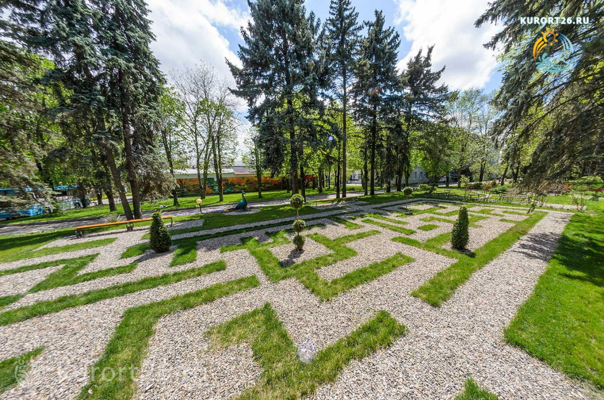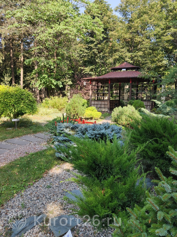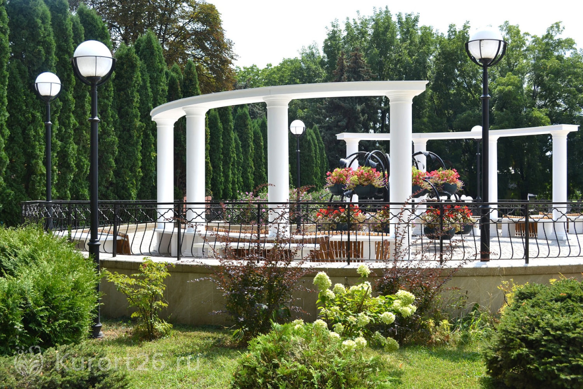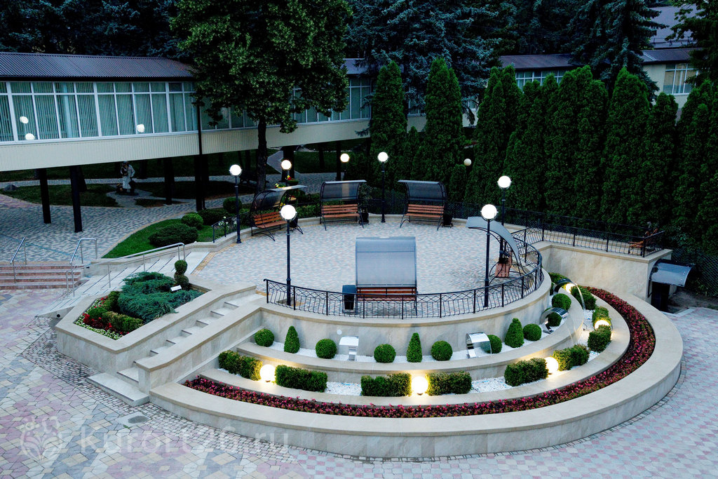 - Территория санатория одна из самых красивых в городе. Парк разделен на тематические зоны: лесную, азиатскую, детскую и др. Украшают парк каскадные фонтаны, ротонды, зеленые скульптуры, тематические беседки, альпийские горки, цветники, зеленые лужайки с шезлонгами для загара