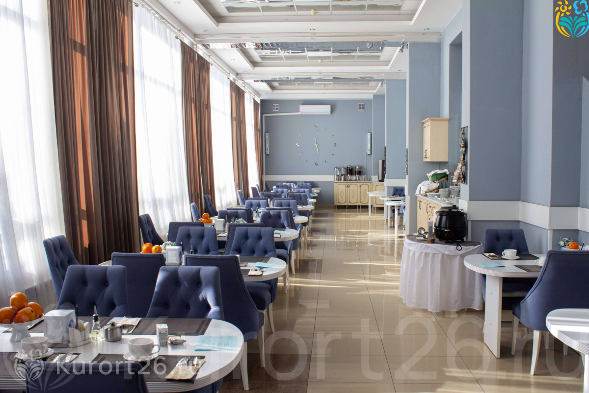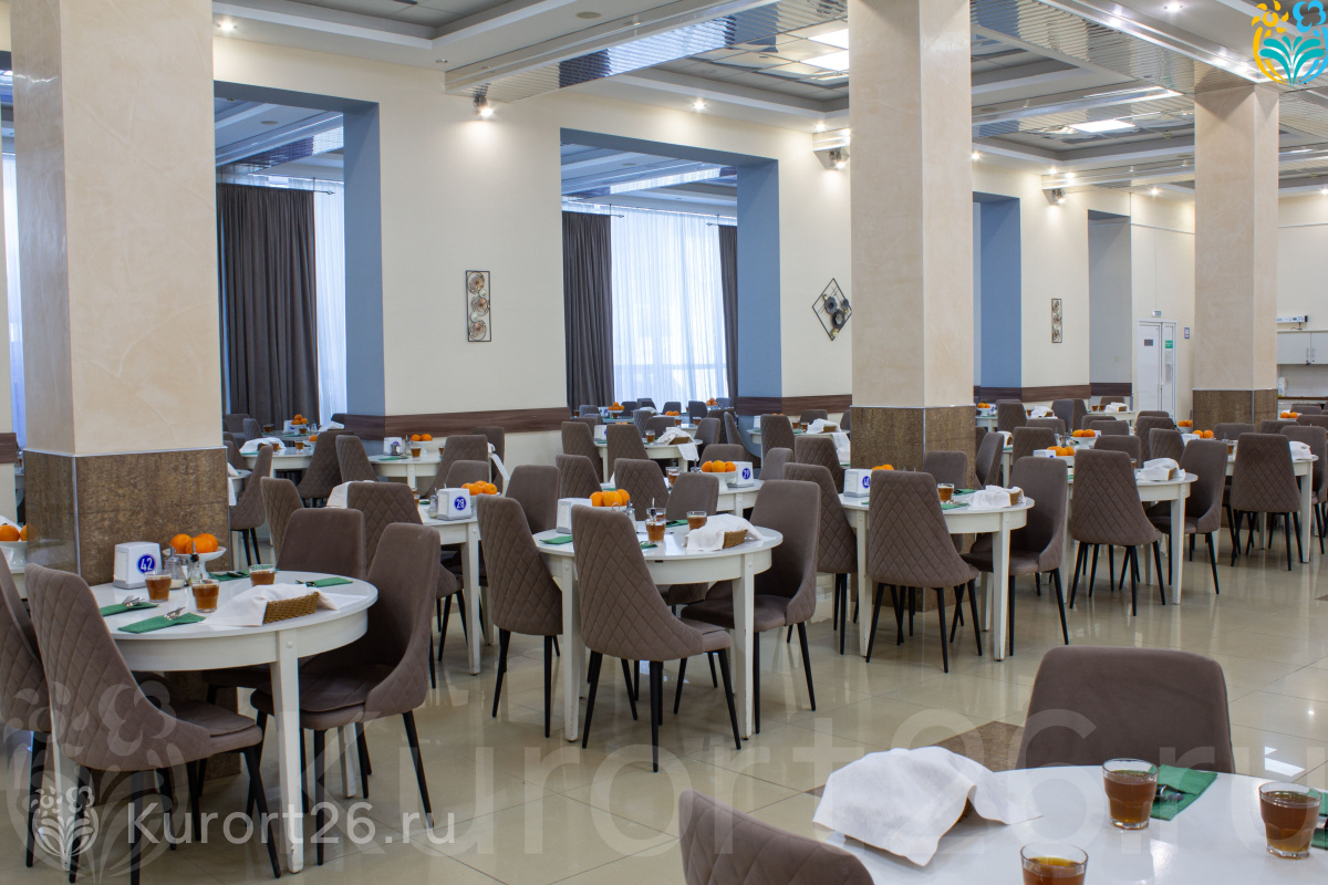 Питание организовано в двух просторных залах столовой: основной зал вмещает до 320 человек, VIP-зал рассчитан на 70 гостей. В санатории организовано трёхразовое диетическое питание по системе «меню-заказ». Гости могут выбрать блюда из пяти лечебных диет, составленных с учётом индивидуальных рекомендаций врачей.