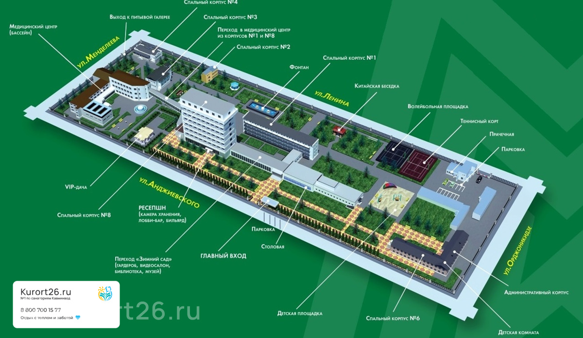 - Тихая часть курортной зоны. 7–12 минут прогулки до бювета, Курортного парка и Грязелечебницы им. Семашко