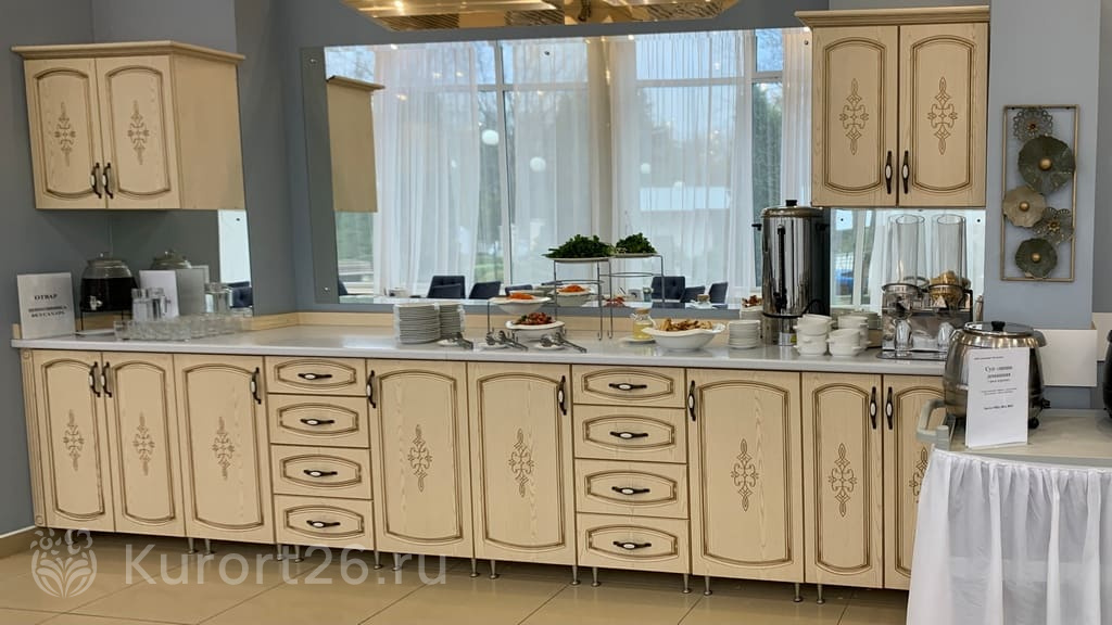 Питание «меню-заказ» с учётом пяти лечебных диет. В просторных обеденных залах, рассчитанных на 70 и 320 человек, подают блюда из свежих овощей, фруктов и кисломолочных продуктов.