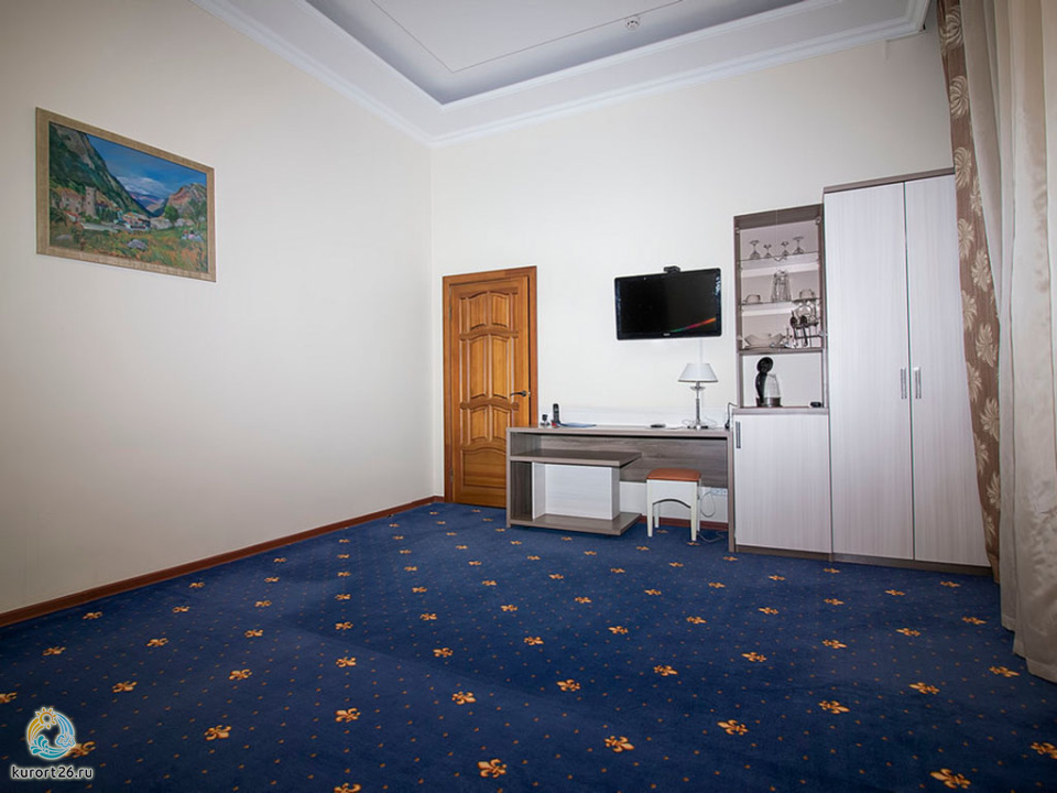 телевизор, фен, сейф, телефон, интернет в номере, ванные принадлежности, двуспальная кровать, шкаф, диван, электрочайник, стол, зеркало, джакузи, стул, посуда, мини-холодильник