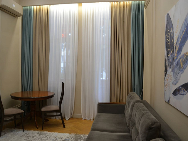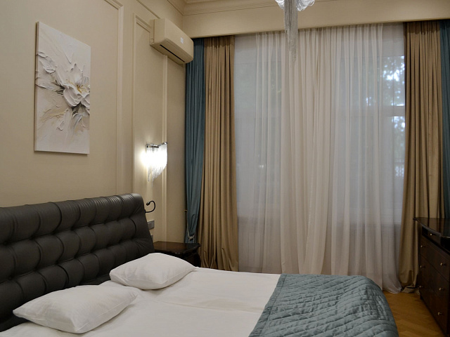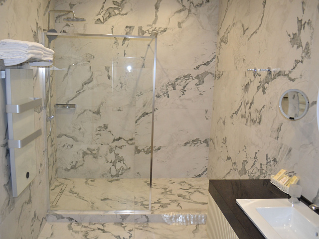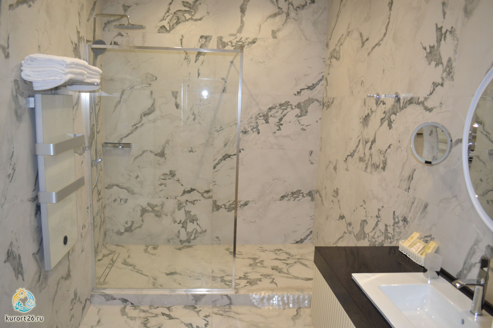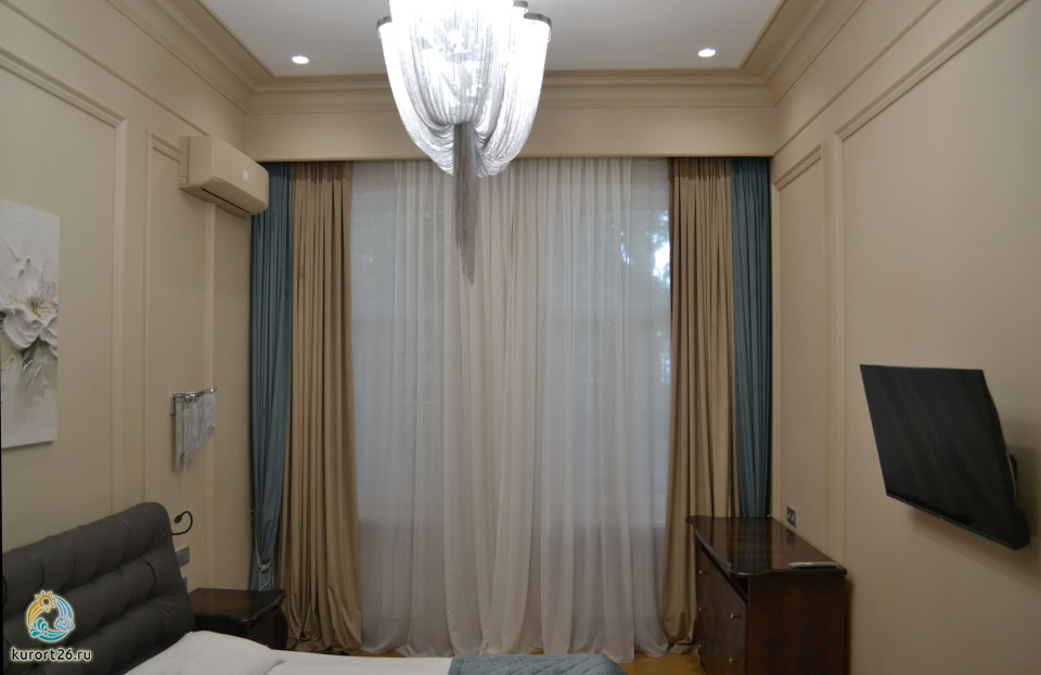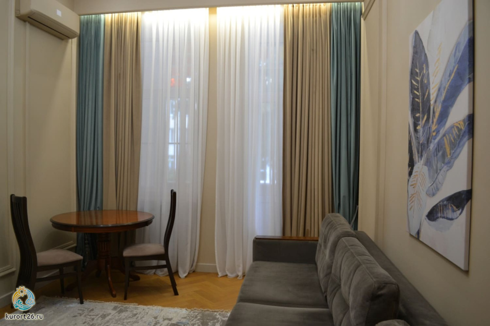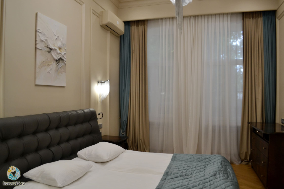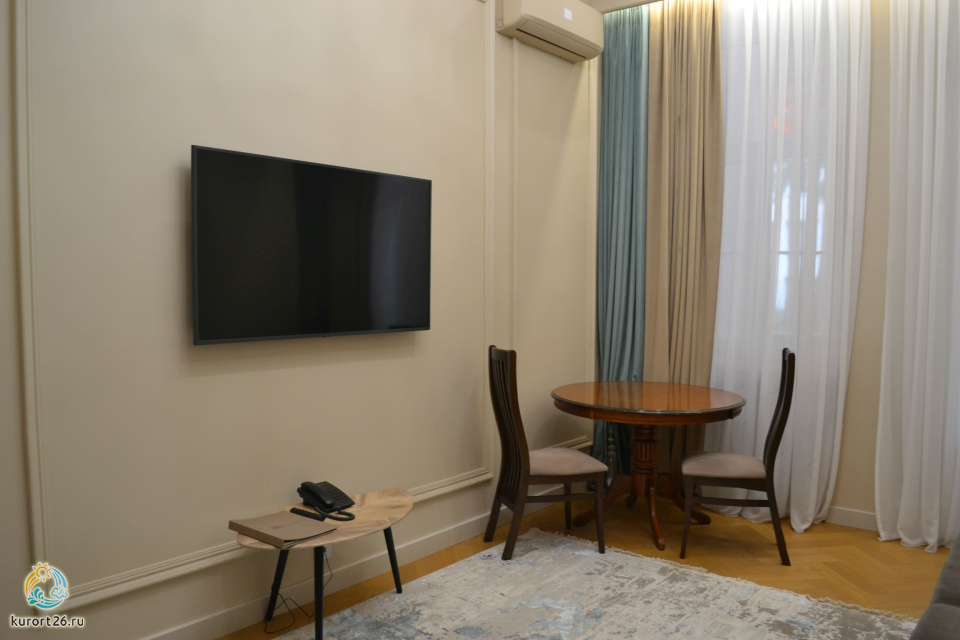 кондиционер, фен, балкон, сейф, телефон, интернет в номере, ванные принадлежности, двуспальная кровать, шкаф, диван, электрочайник, стол, зеркало, два телевизора, мини-холодильник, Санузел с душем, Набор посуды