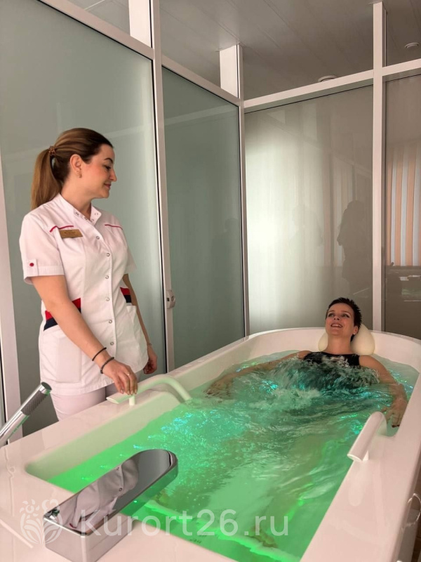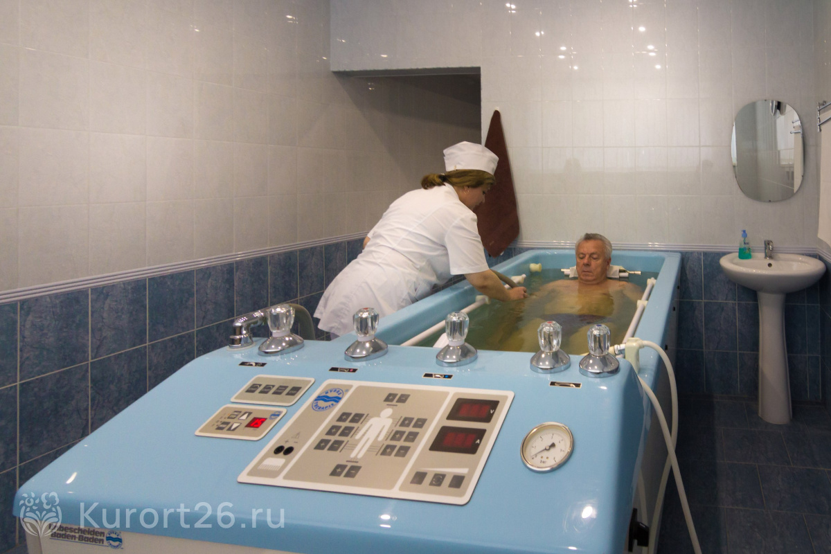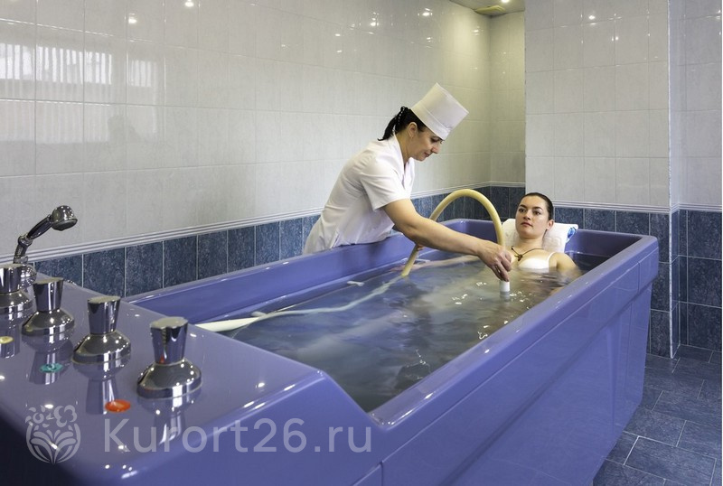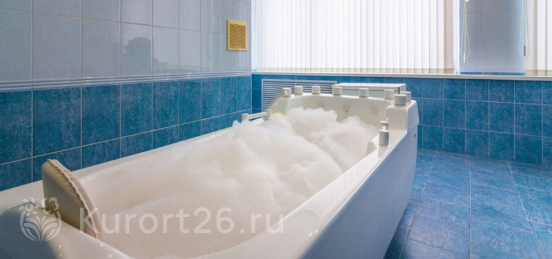 Два вида минеральных ванн — углекисло-минеральные и углекисло-сероводородные. Подводный душ-массаж ручной и в гидромассажной ванне «Каракалла»