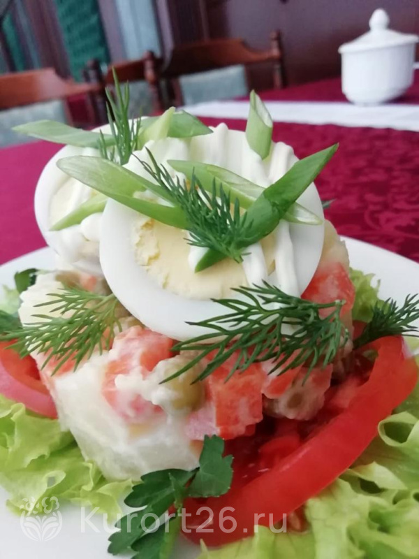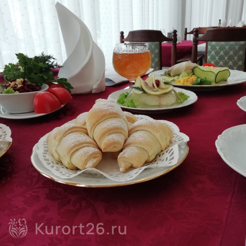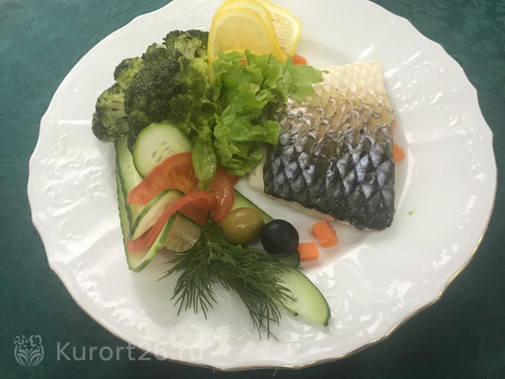 Трёхразовое питание «шведский стол». Отдельное заказное меню для гостей категории «Люкс». Есть специальные диеты — антихолестериновая и низкокалорийная. На территории: банкетный зал, летний бар