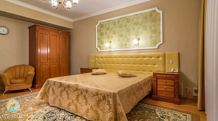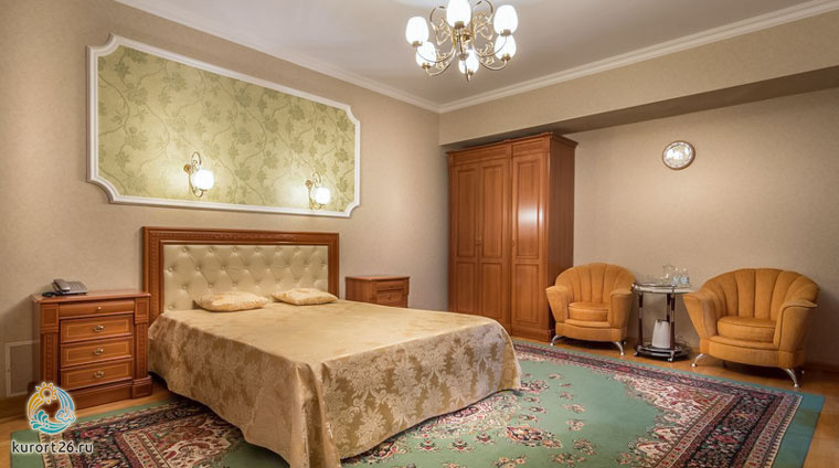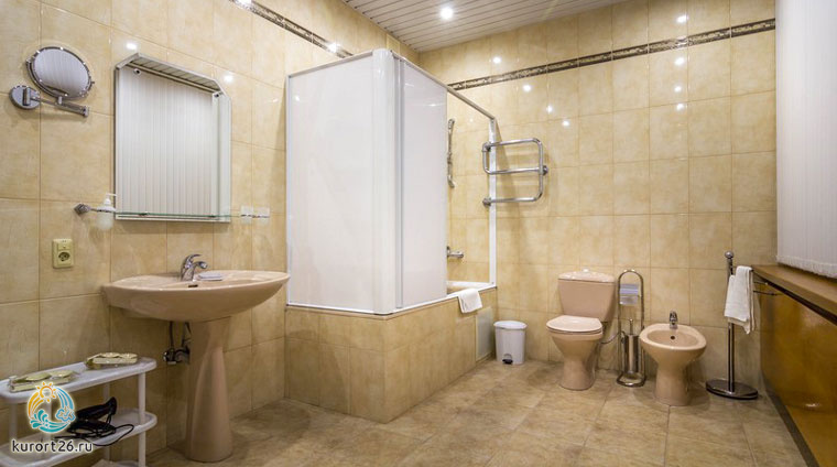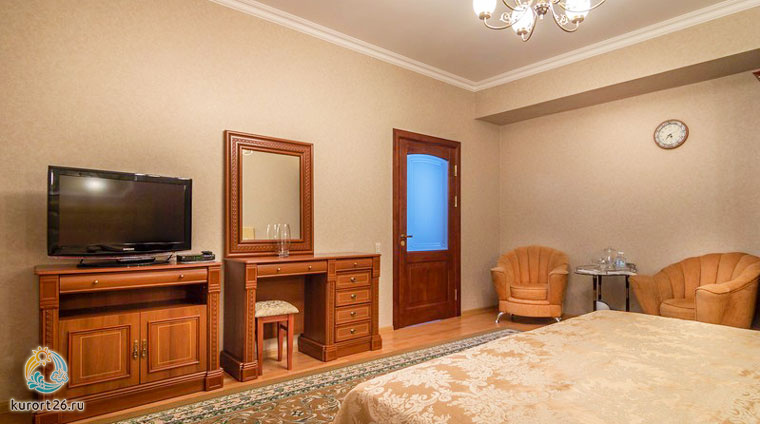 Двухместный однокомнатный номер второго корпуса включает: двуспальную кровать, прикроватные тумбочки, набор мягкой мебели, набор летней мебели для лоджии, шкаф, столик с зеркалом, телевизор, холодильник, электрочайник, телефон. В ванной — необходимые принадлежности и фен. В номере — бесплатный выход в интернет.