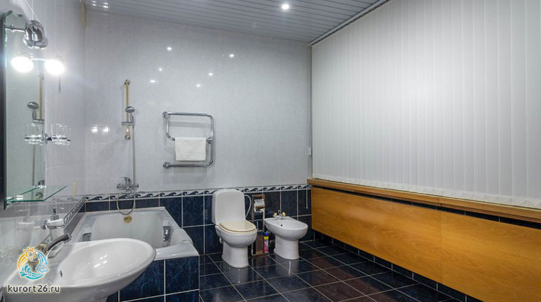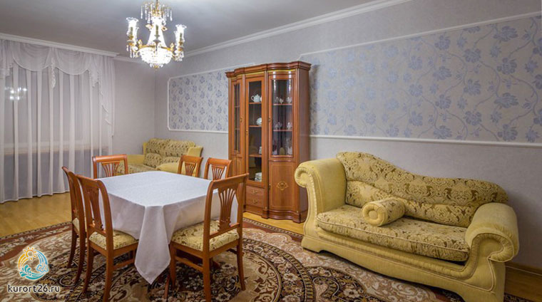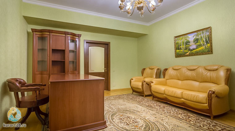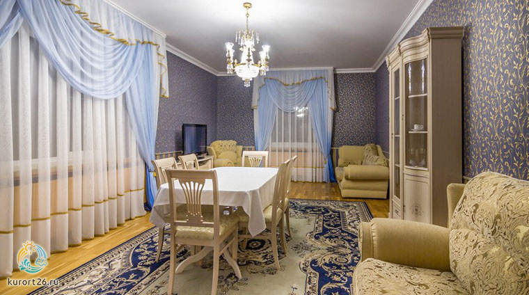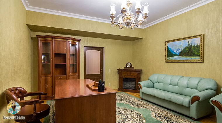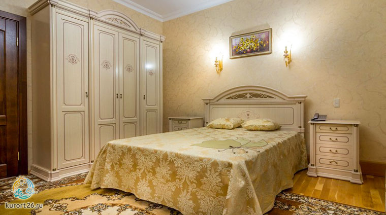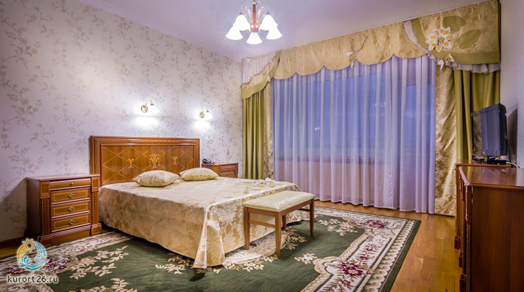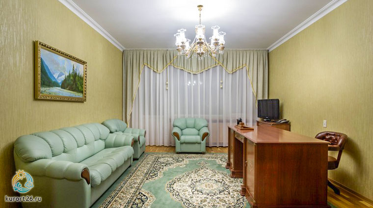 Двухместный трёхкомнатный номер Люкс во втором корпусе состоит из гостиной, спальни и кабинета, а также лоджии и своей ванной с необходимыми принадлежностями и феном. В номере: двуспальная кровать, прикроватные тумбочки, шкаф, набор мягкой и летней мебели, столик с зеркалом, обеденный стол со стульями, телевизор, холодильник, электрочайник, телефон и бесплатный выход в интернет.
