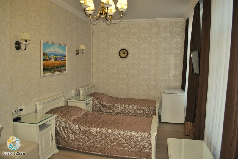холодильник, телевизор, фен, сейф, телефон, интернет в номере, ванные принадлежности, электрочайник, посуда, две односпальные кровати, санузел с ванной или душевой кабиной