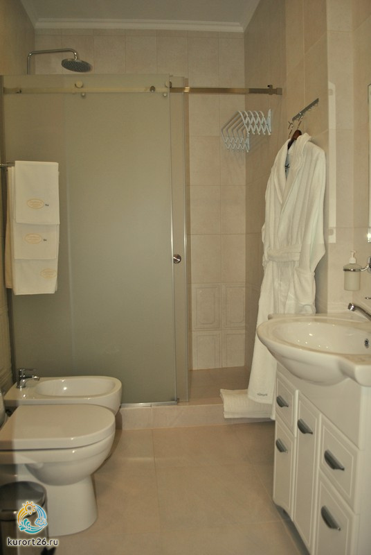 холодильник, кондиционер, телевизор, фен, сейф, телефон, санузел с душевой кабиной, ванные принадлежности, халат, тапочки, двуспальная кровать, электрочайник, биде, Wi-Fi, Набор посуды