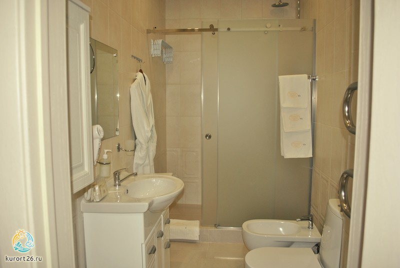 холодильник, кондиционер, телевизор, фен, сейф, телефон, санузел с душевой кабиной, ванные принадлежности, халат, тапочки, двуспальная кровать, электрочайник, биде, Wi-Fi, Набор посуды